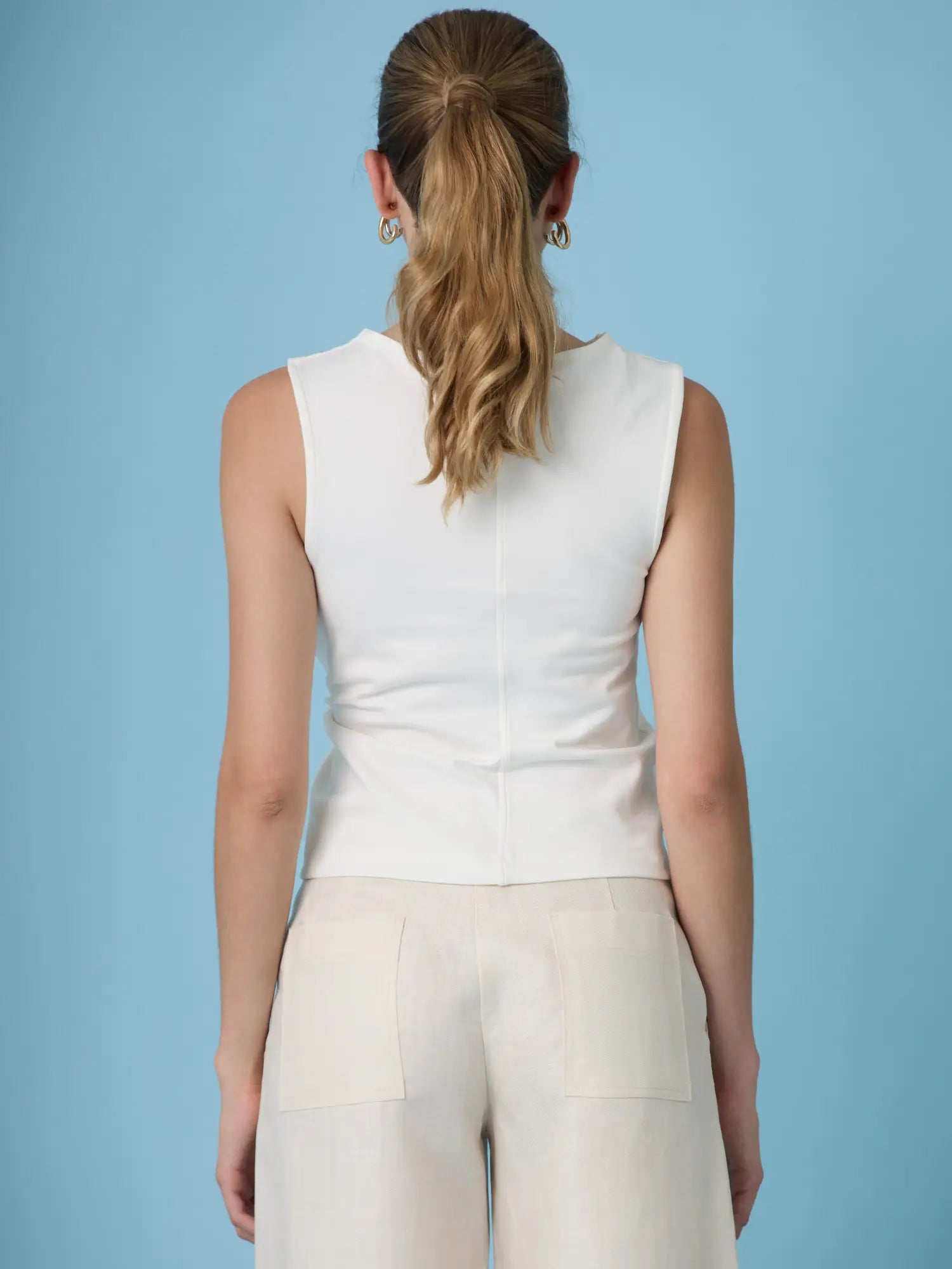 Blusa sin mangas con escote barco y drapeado en nudo lateral; bajo recto con pequeña abertura, estiliza la cintura, perfecta para oficina y looks sofisticados.