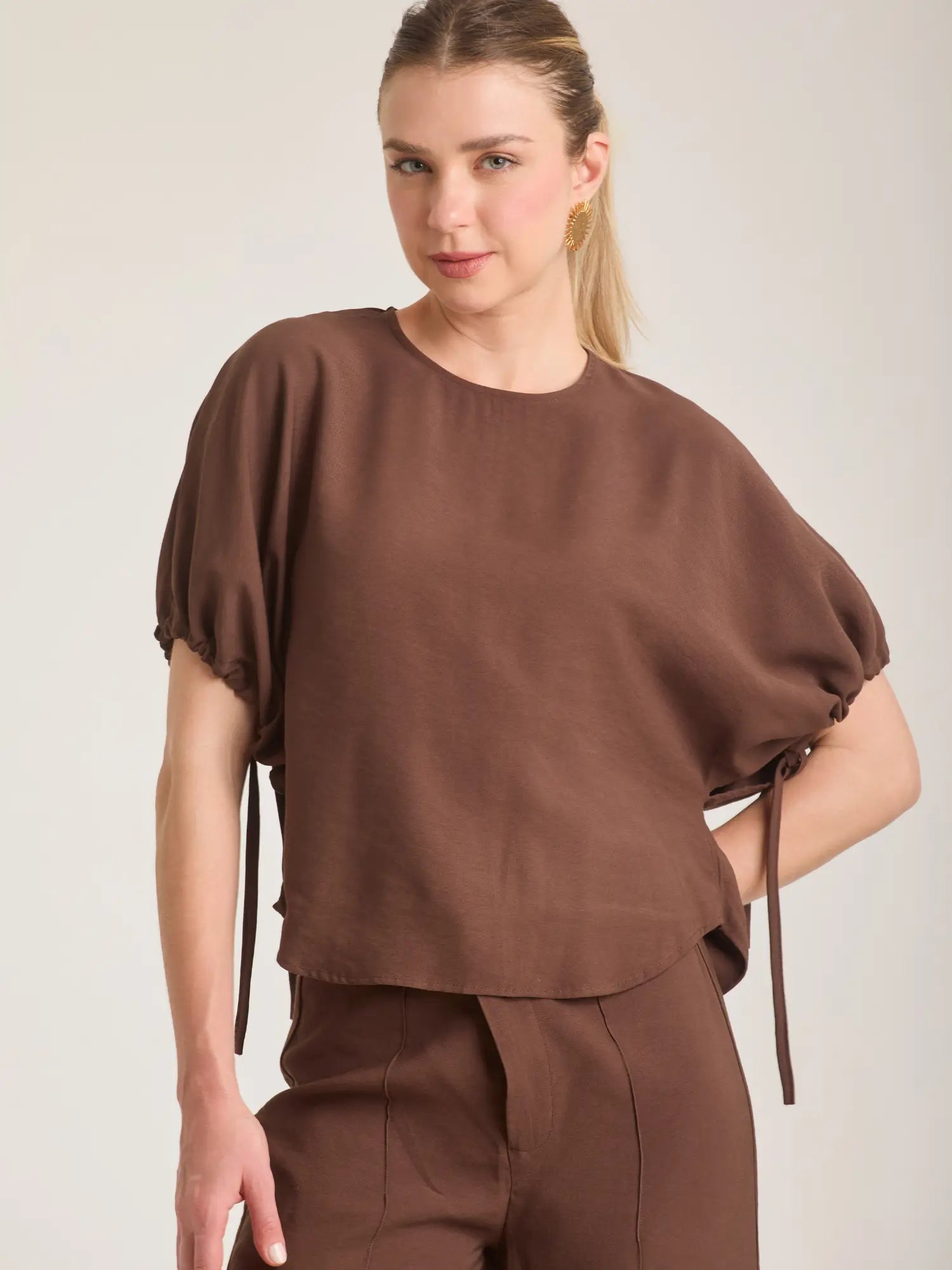 Blusa de manga globo con frunces y lazos laterales, escote redondo y fit relajado; caída fluida y largo a la cadera—fresca y favorecedora para un look casual-elegante.