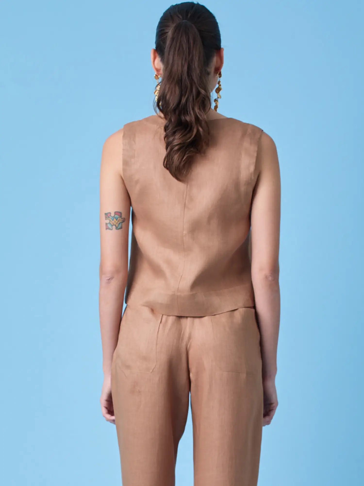 Blusa de cuello en “V” y manga sisa, diseñada en un largo corto con comfort fit que brinda una silueta relajada y favorecedora. Confeccionada sin forro, incorpora aberturas laterales en el ruedo que aportan movimiento y un acabado moderno, ideal para el uso diario.