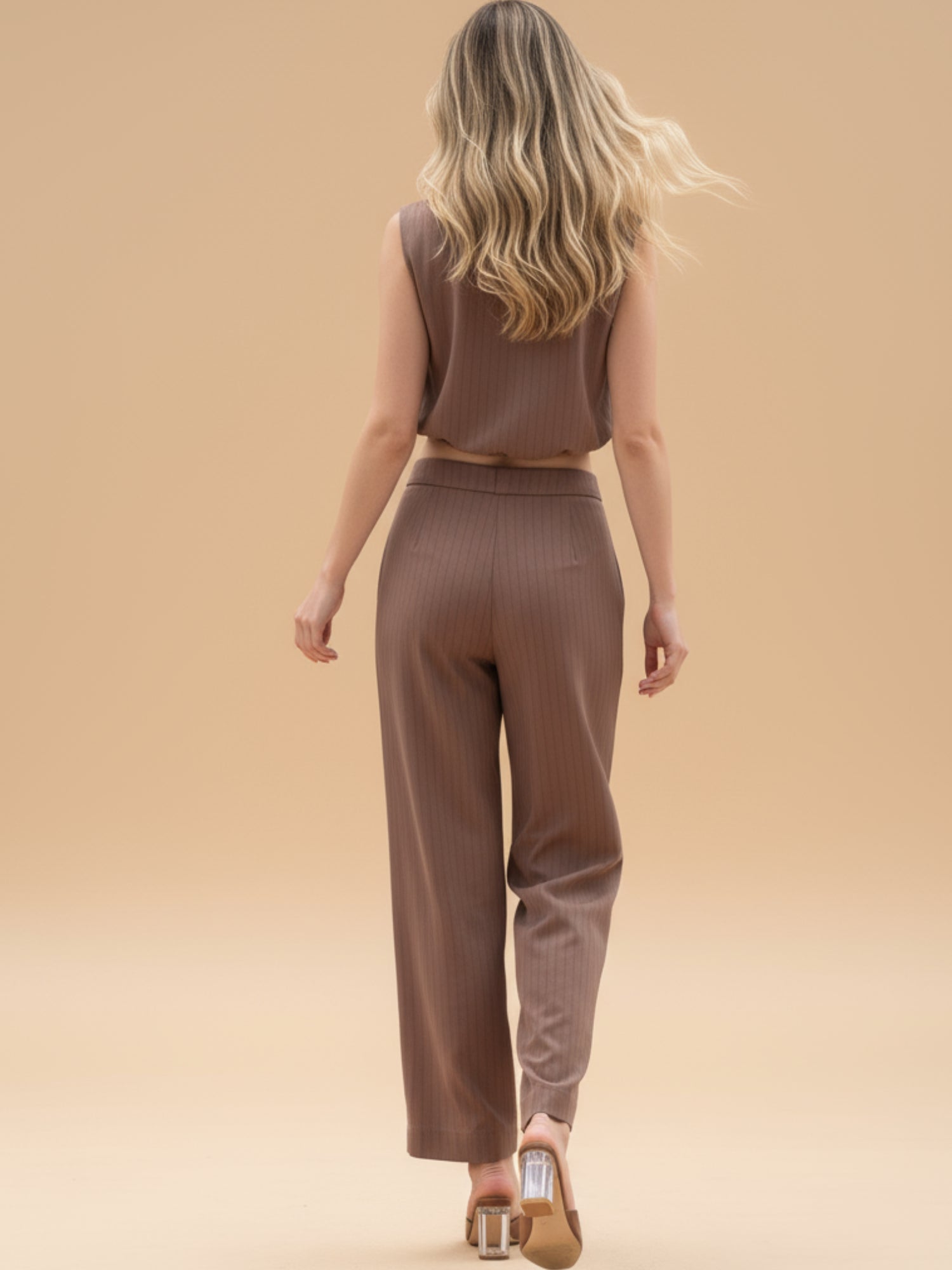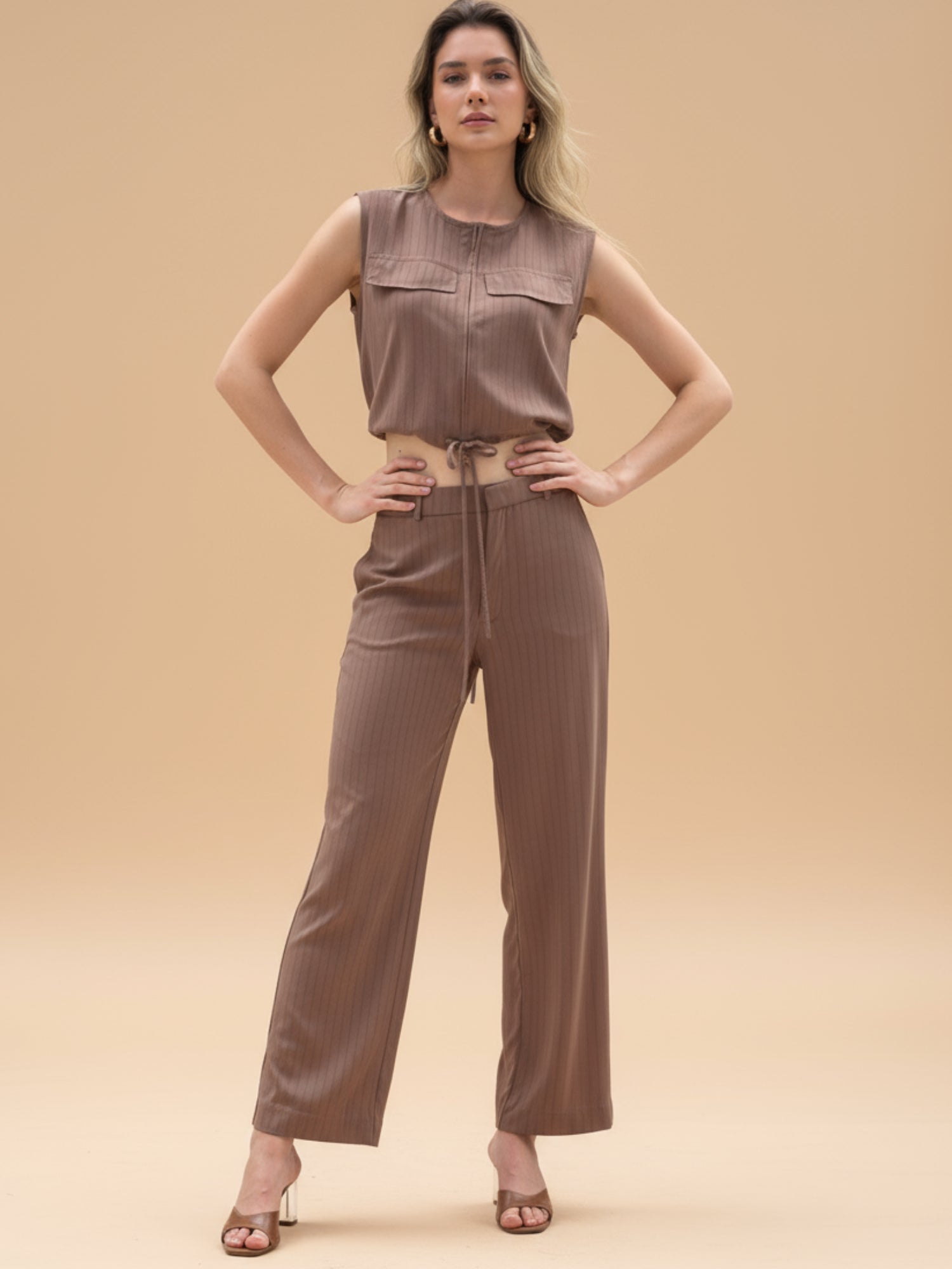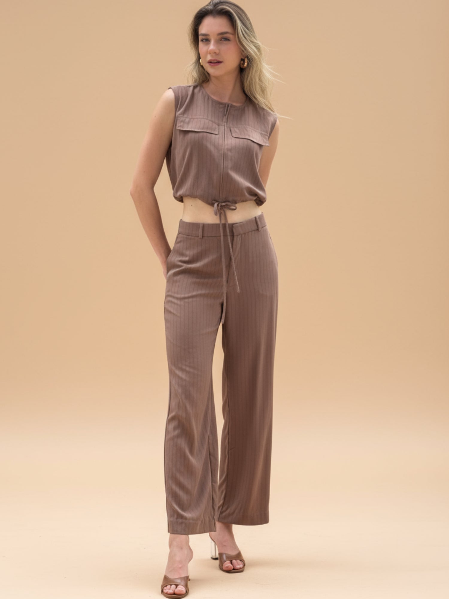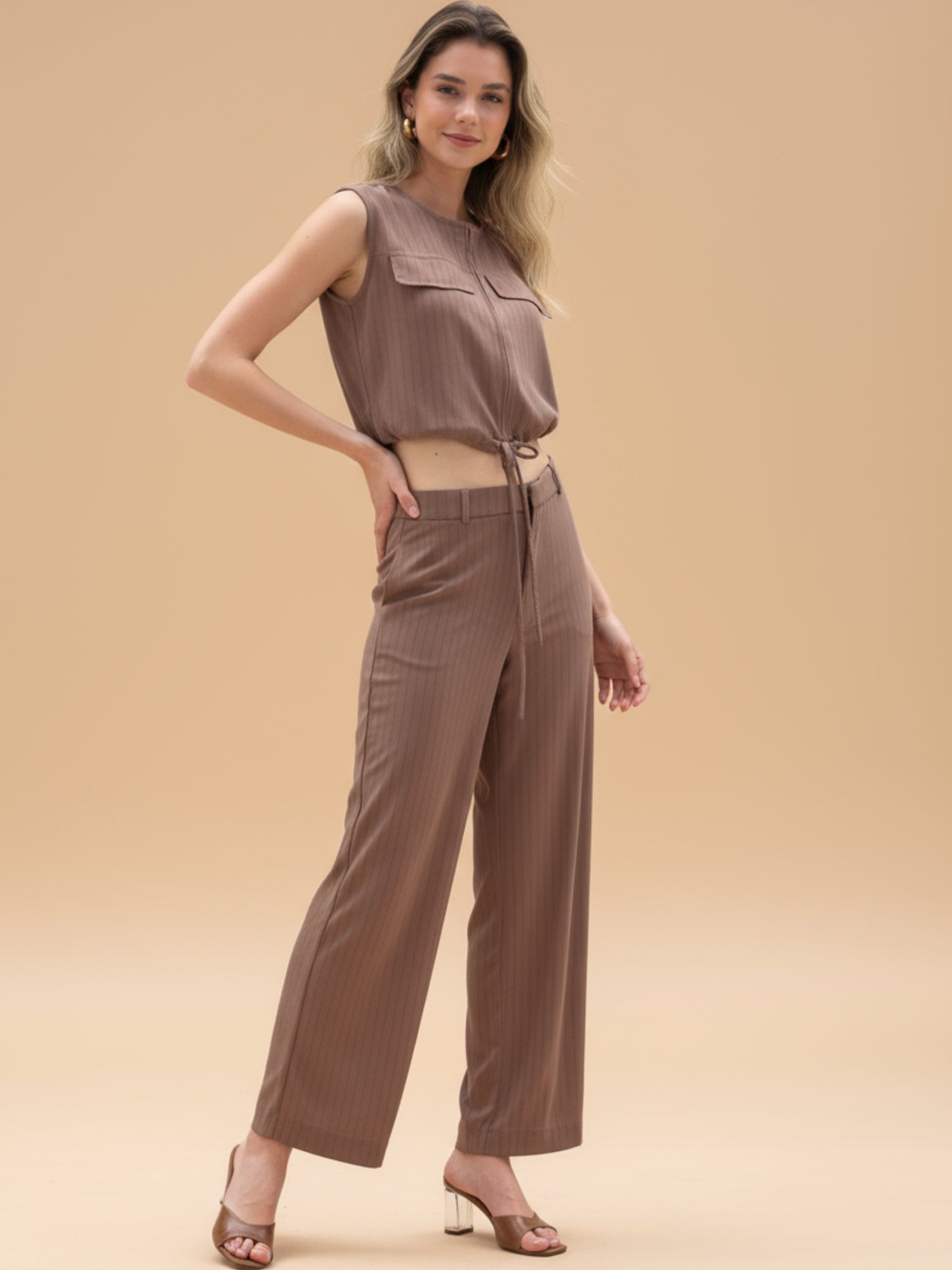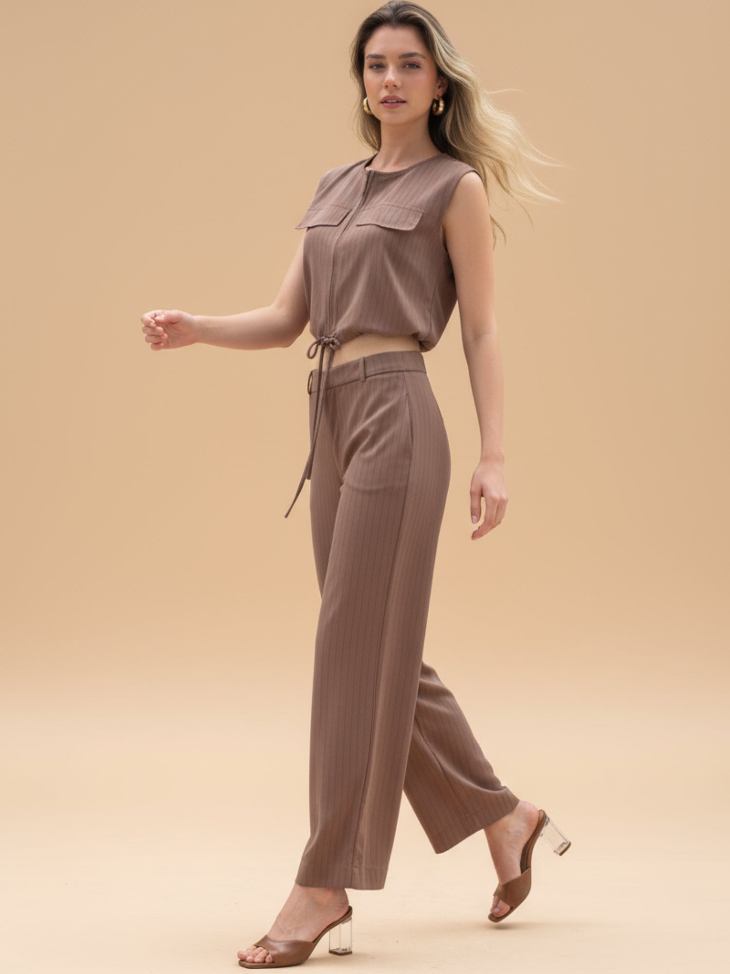 Pantalón de tiro medio-alto y pierna recta fluida; pretina con trabillas y cordón desmontable, textura con rayas finas que estiliza—versátil y cómodo para looks casual-elegantes