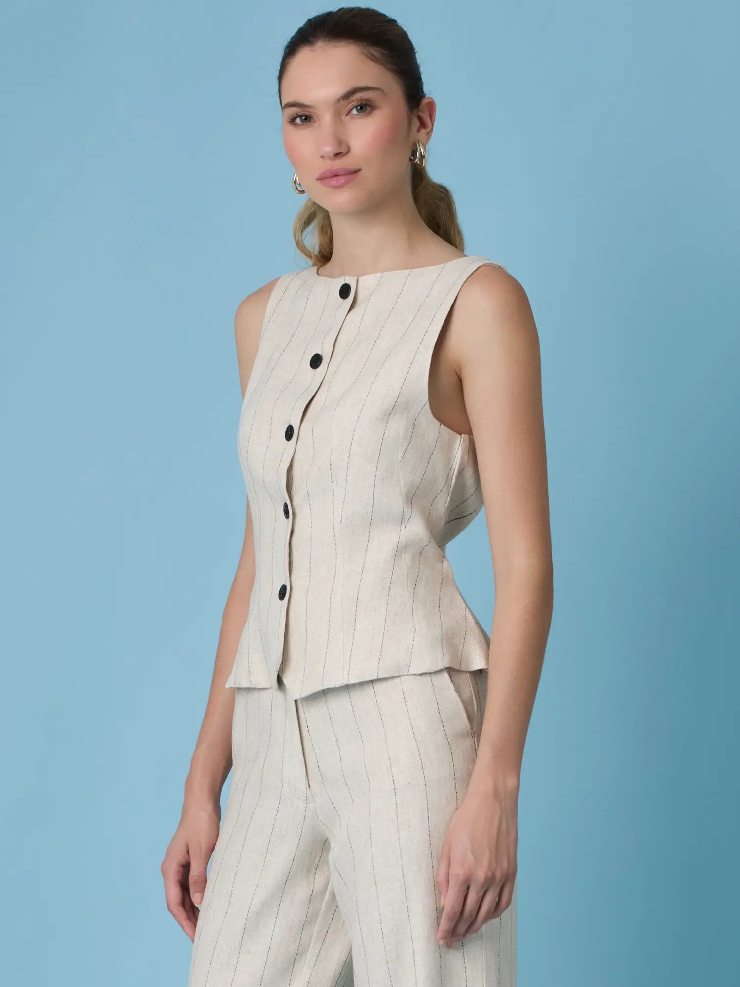 Blusa sin mangas con botones frontales , su diseño entallado en la cintura y el pequeño vuelo en el bajo aportan una silueta elegante. Ideal para looks de oficina, salidas casuales o eventos de día.