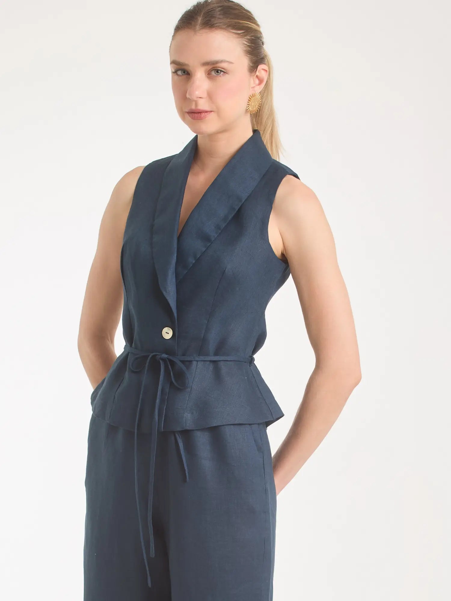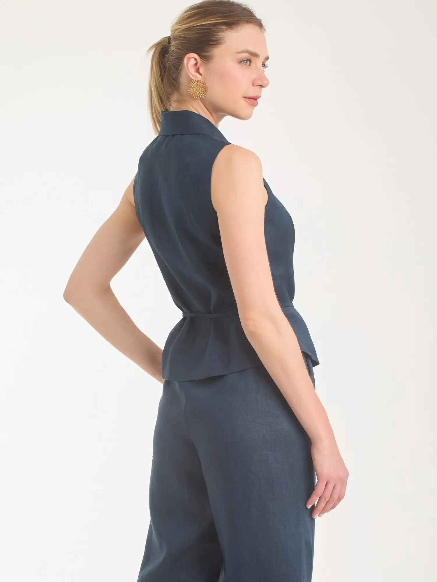 Blusa peplum sin mangas con solapa envolvente y botón frontal; cinturón ajustable que define la cintura—silueta pulida y favorecedora para oficina y eventos