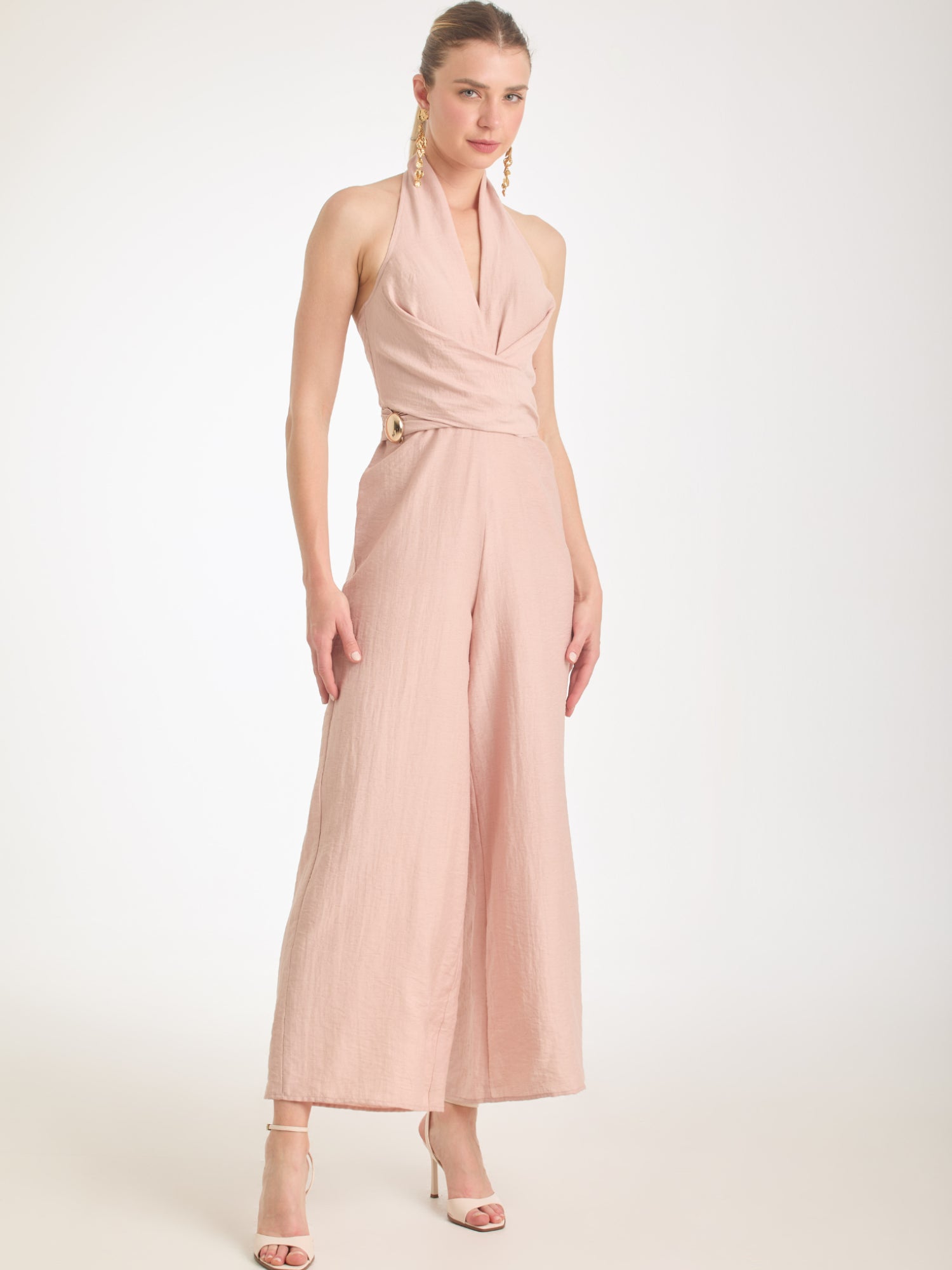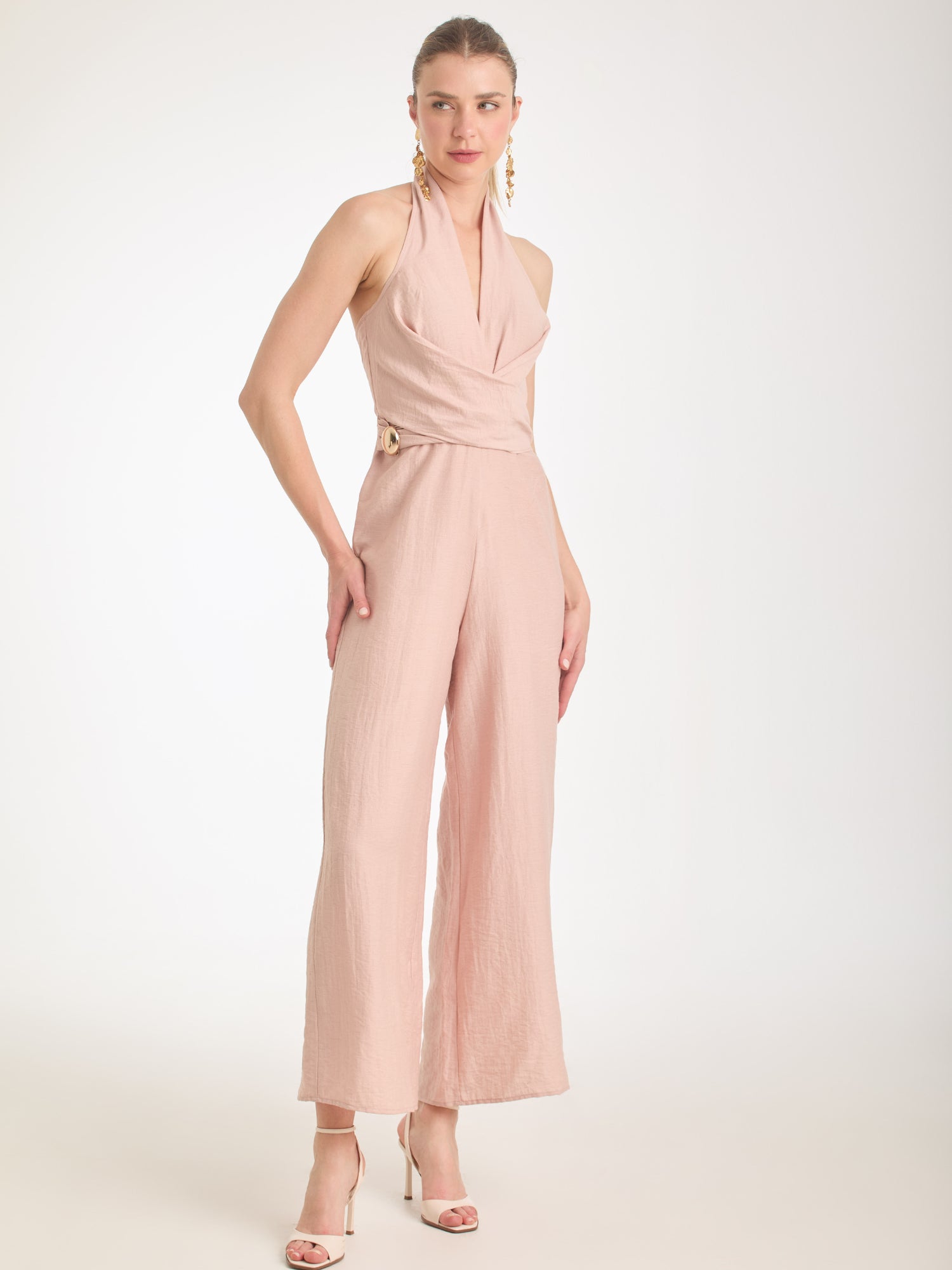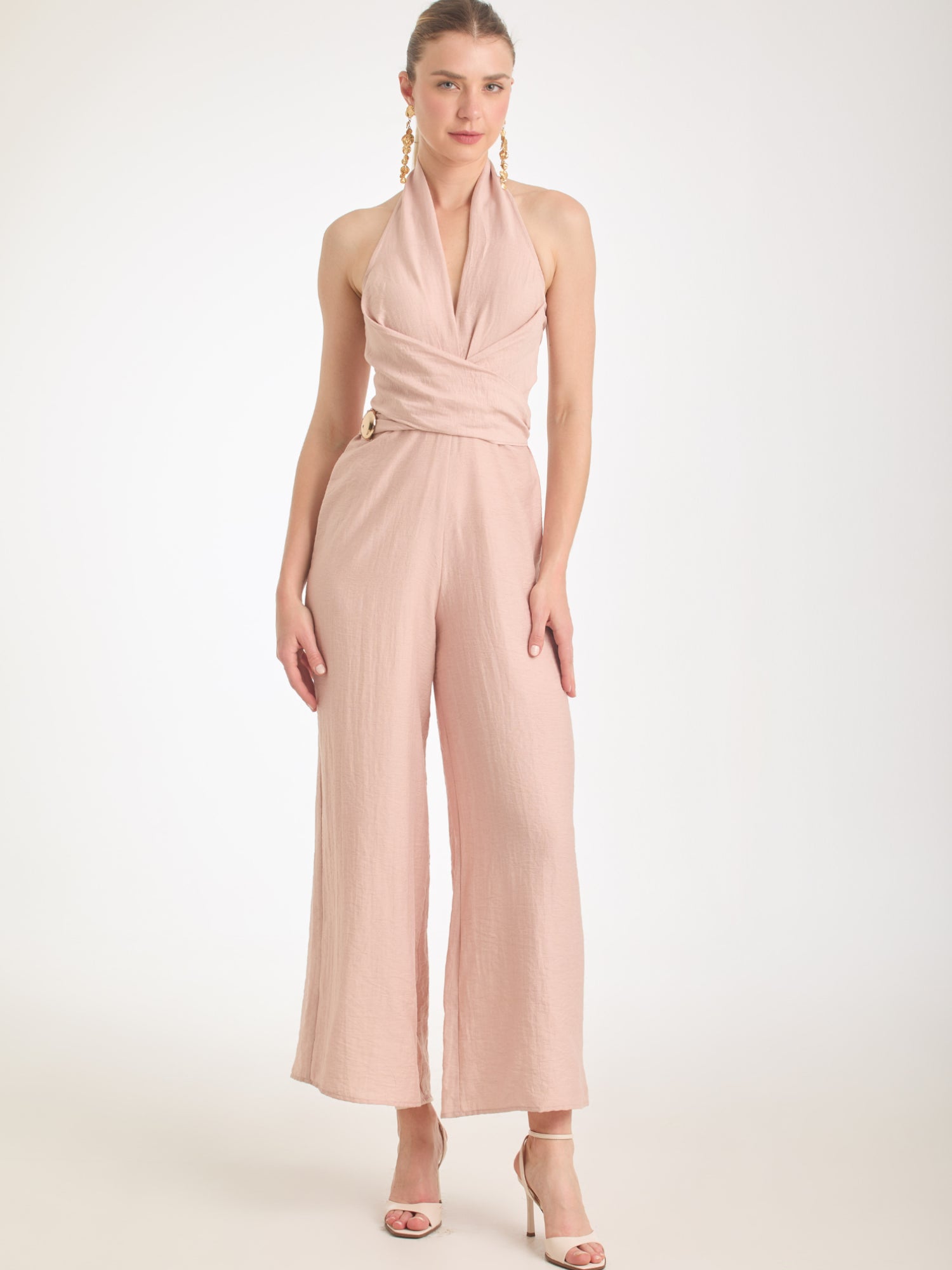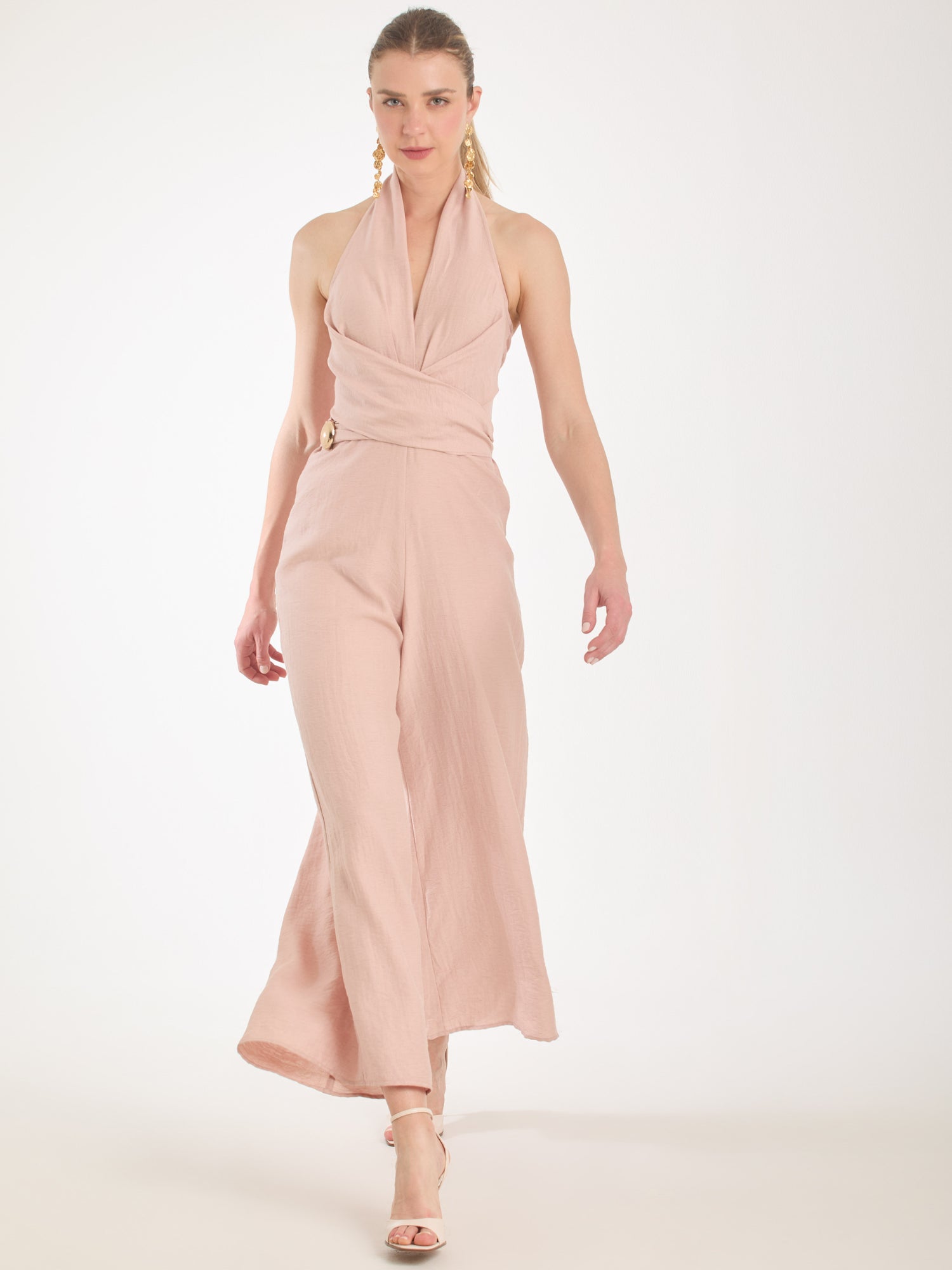 Enterizo de color rosa pálido con un escote halter profundo de corte cruzado que estiliza el torso. El pantalón es de corte recto y ancho (wide leg), aportando fluidez.
