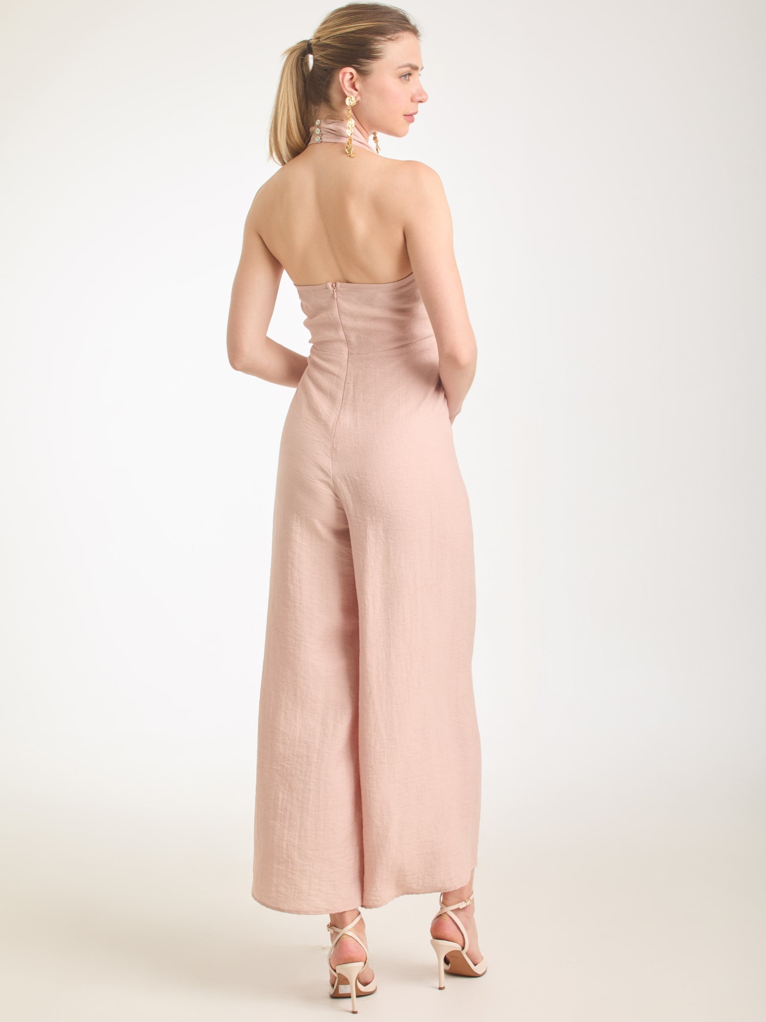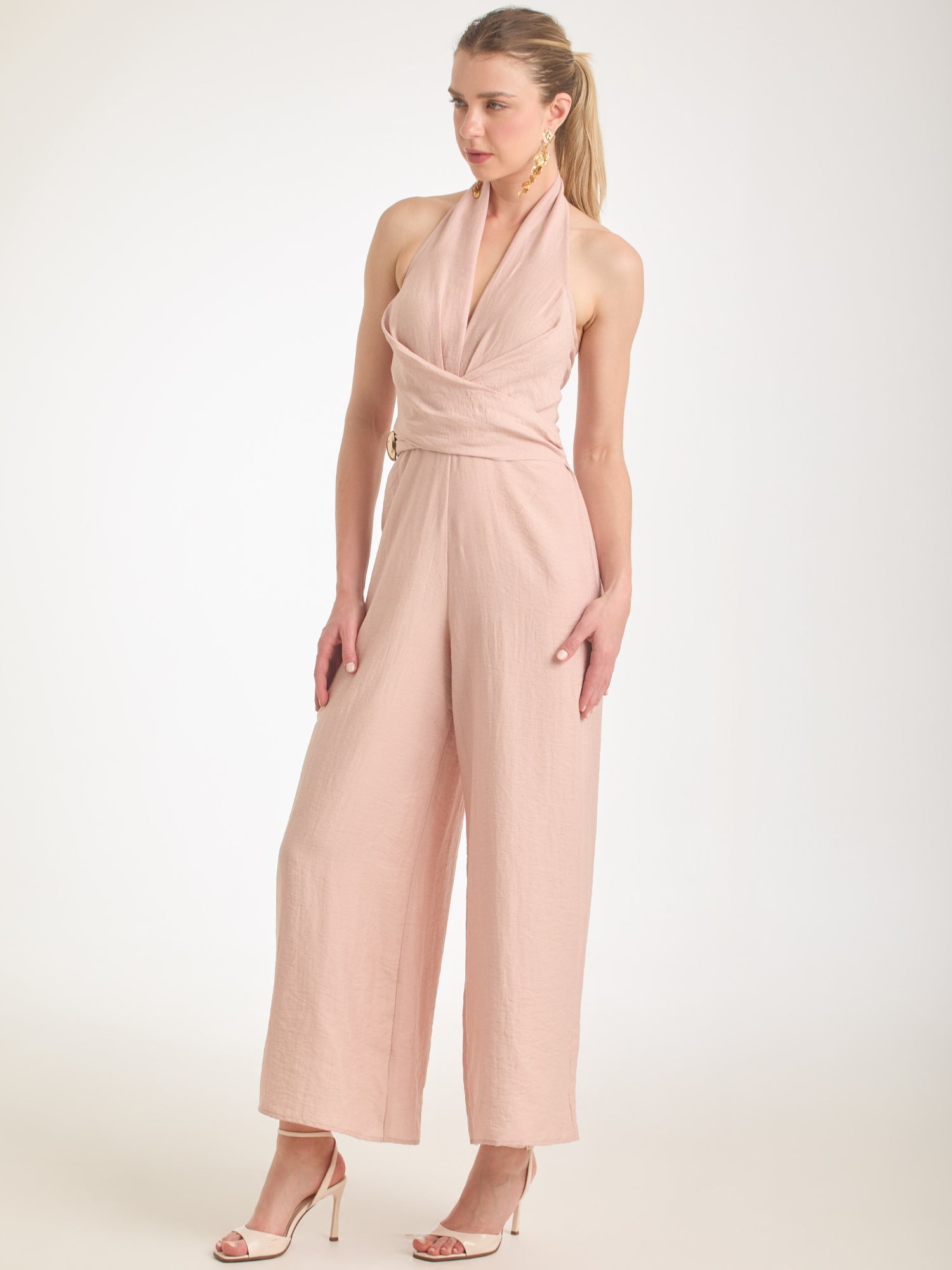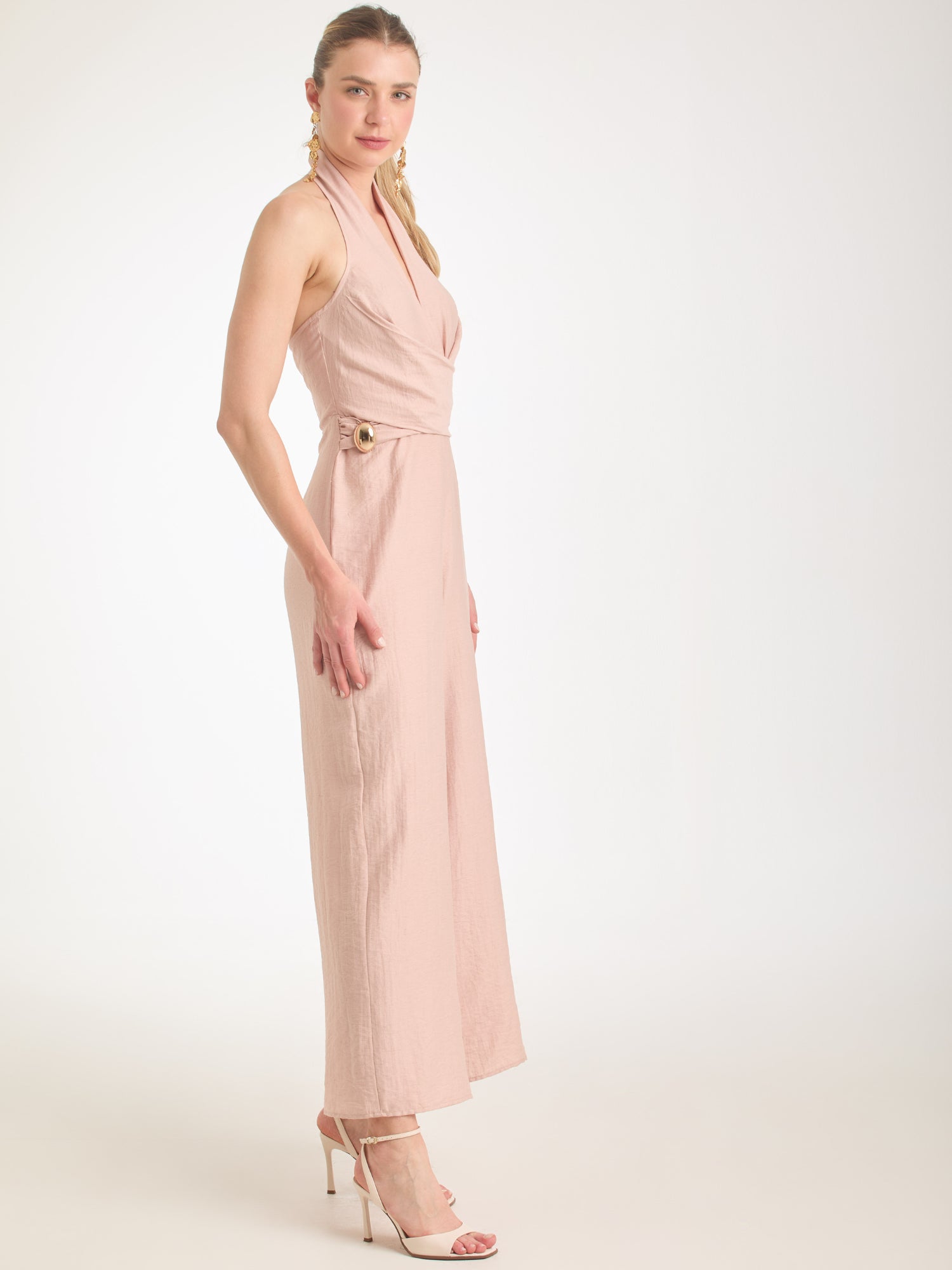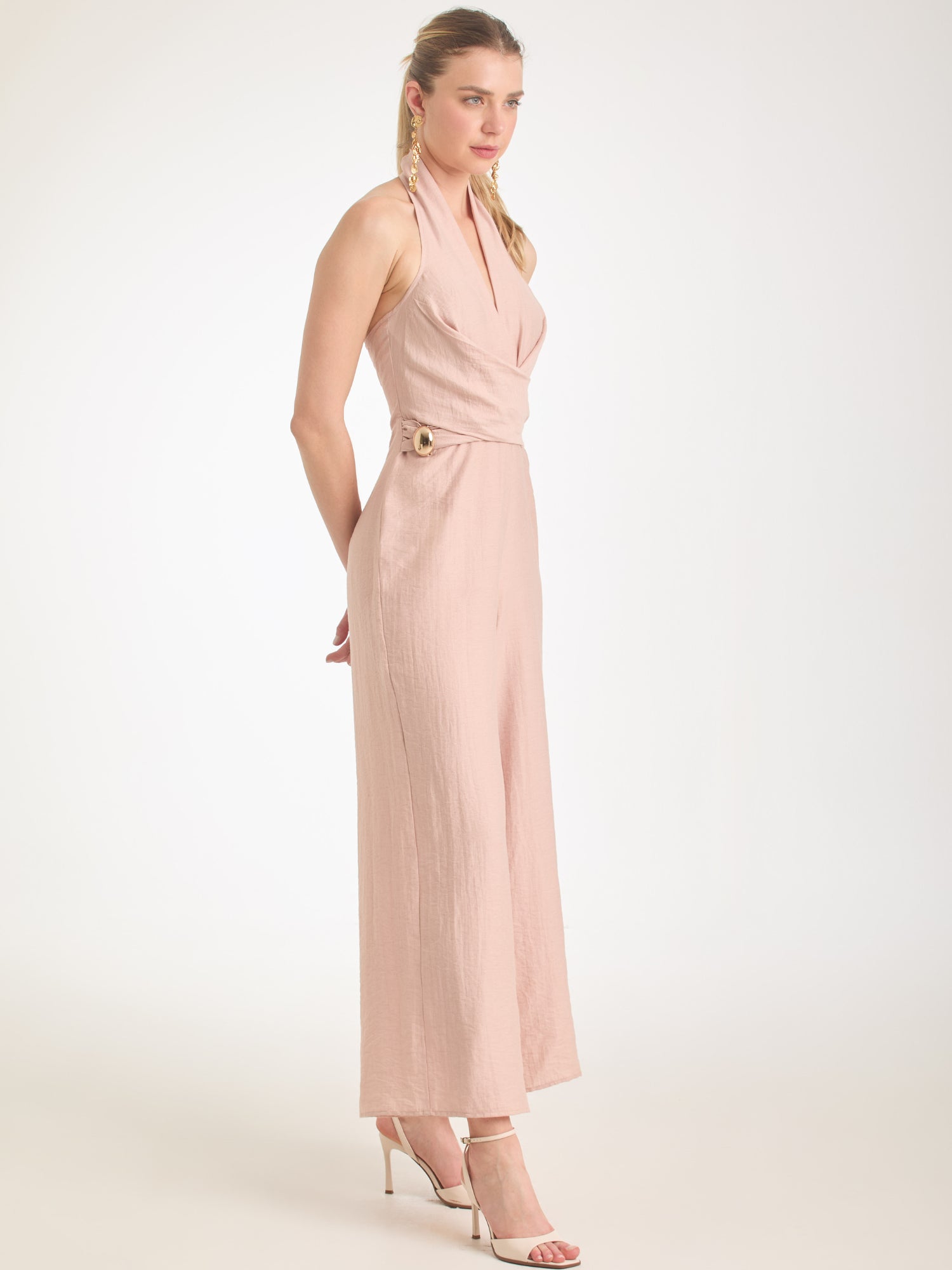 Enterizo de color rosa pálido con un escote halter profundo de corte cruzado que estiliza el torso. El pantalón es de corte recto y ancho (wide leg), aportando fluidez.