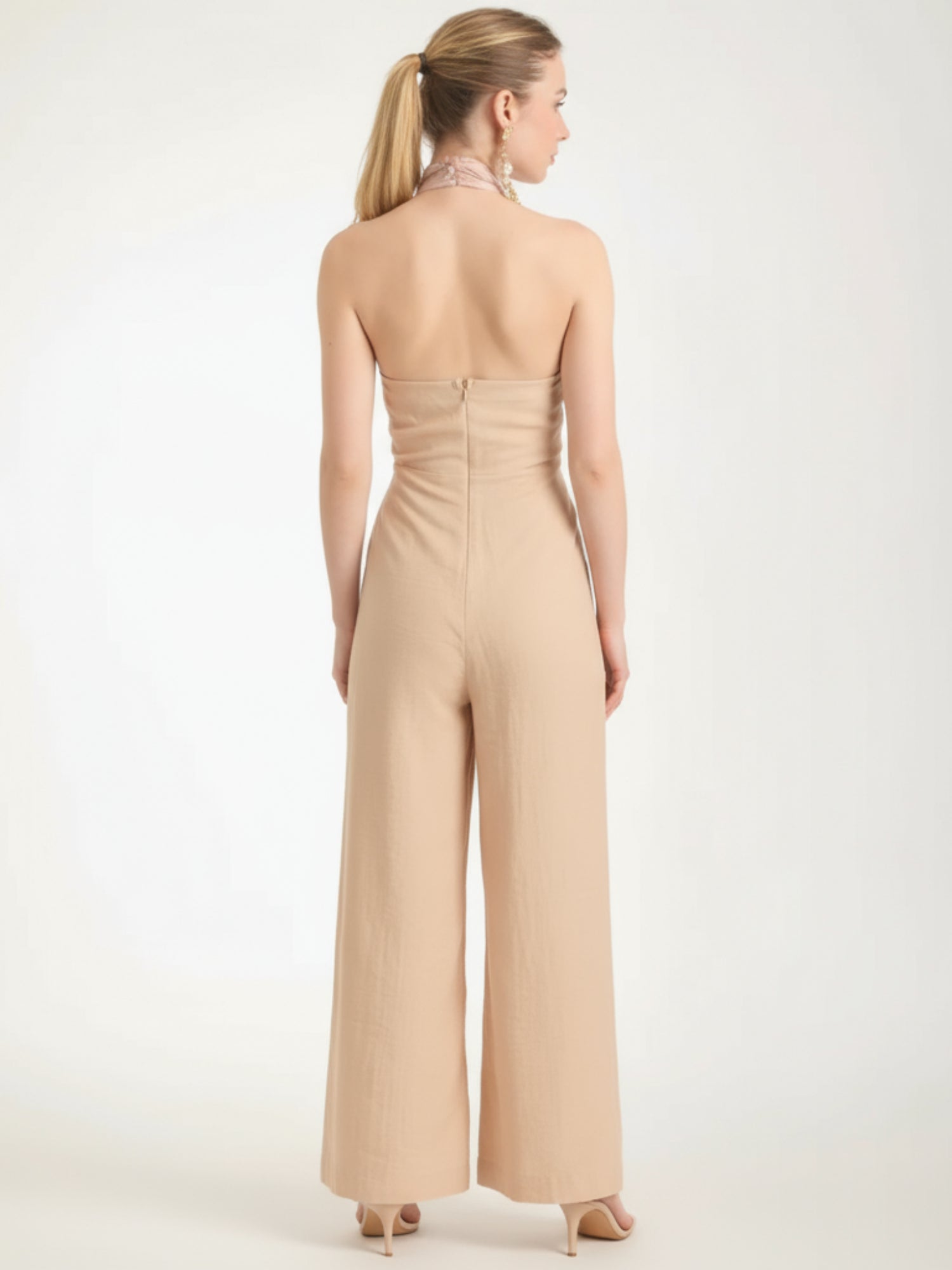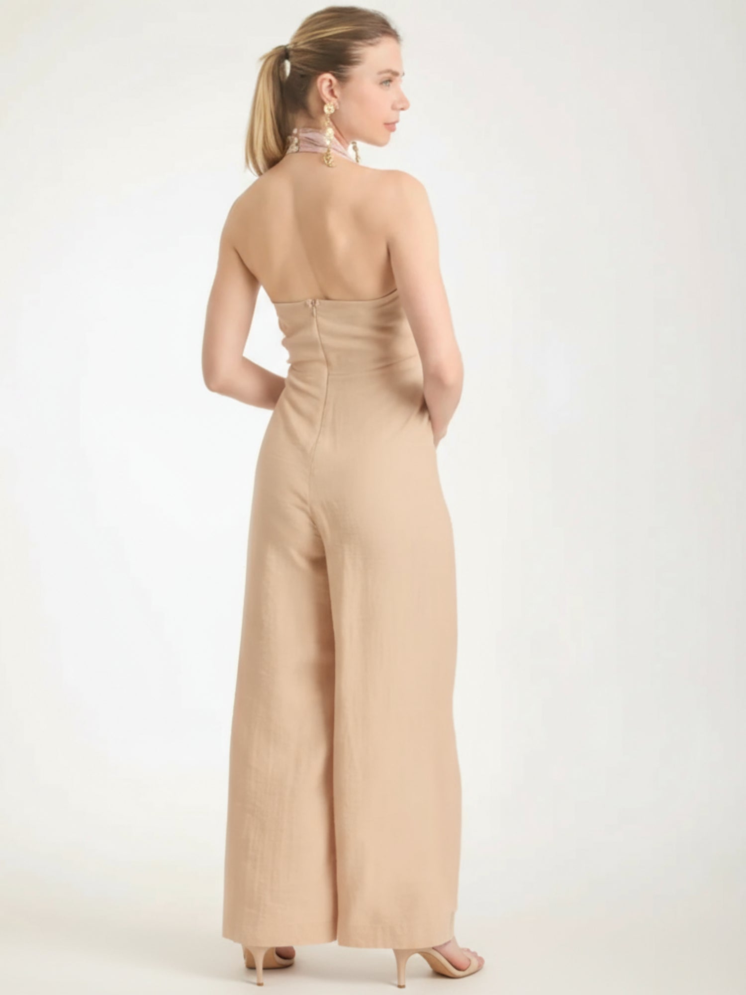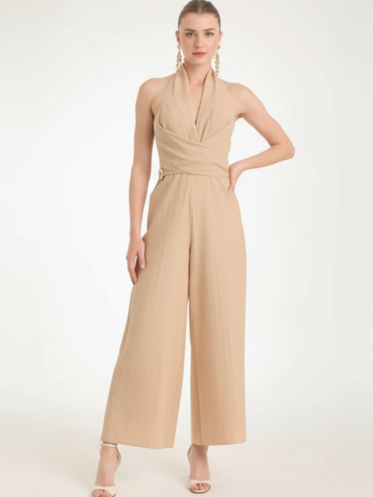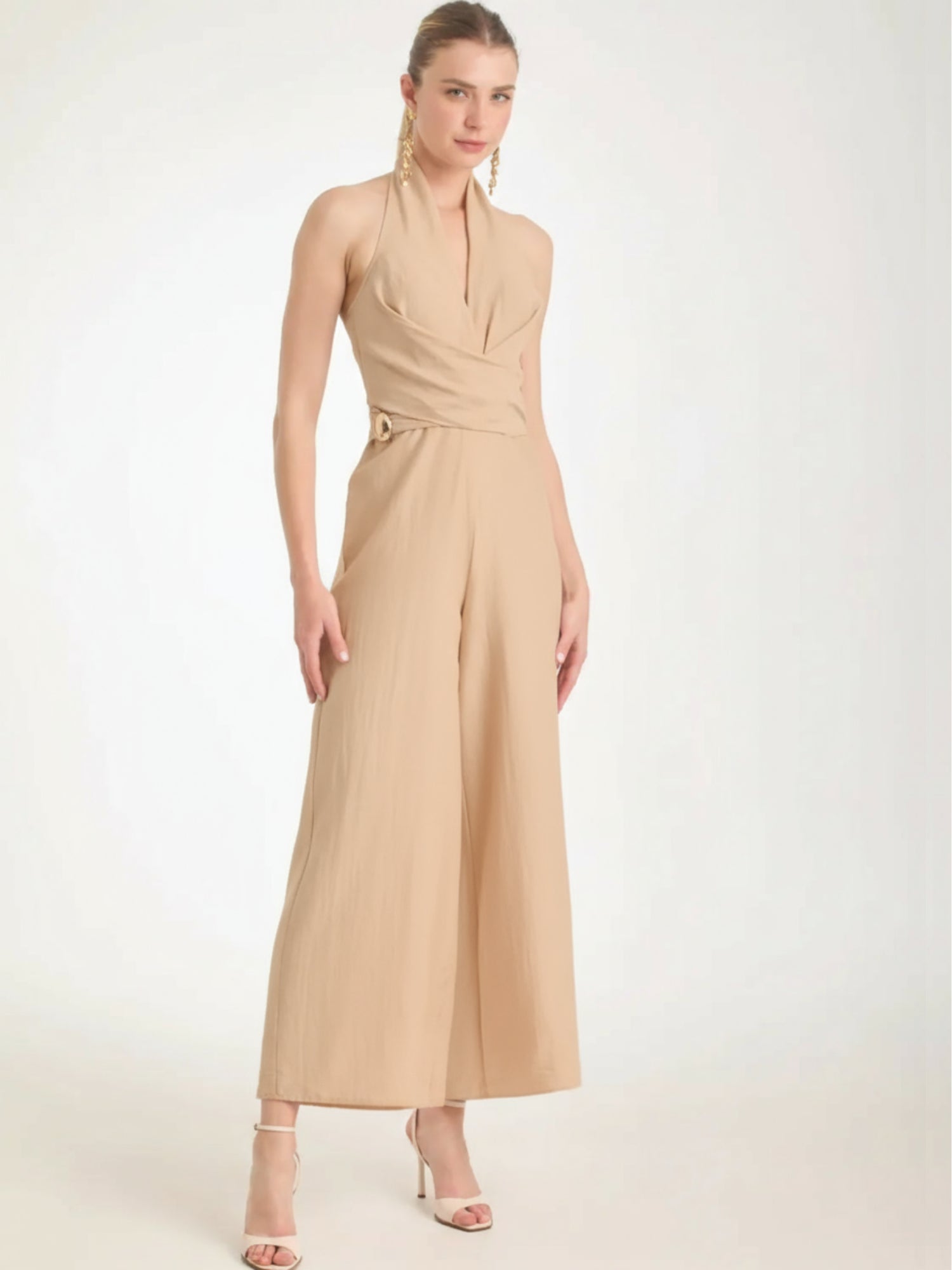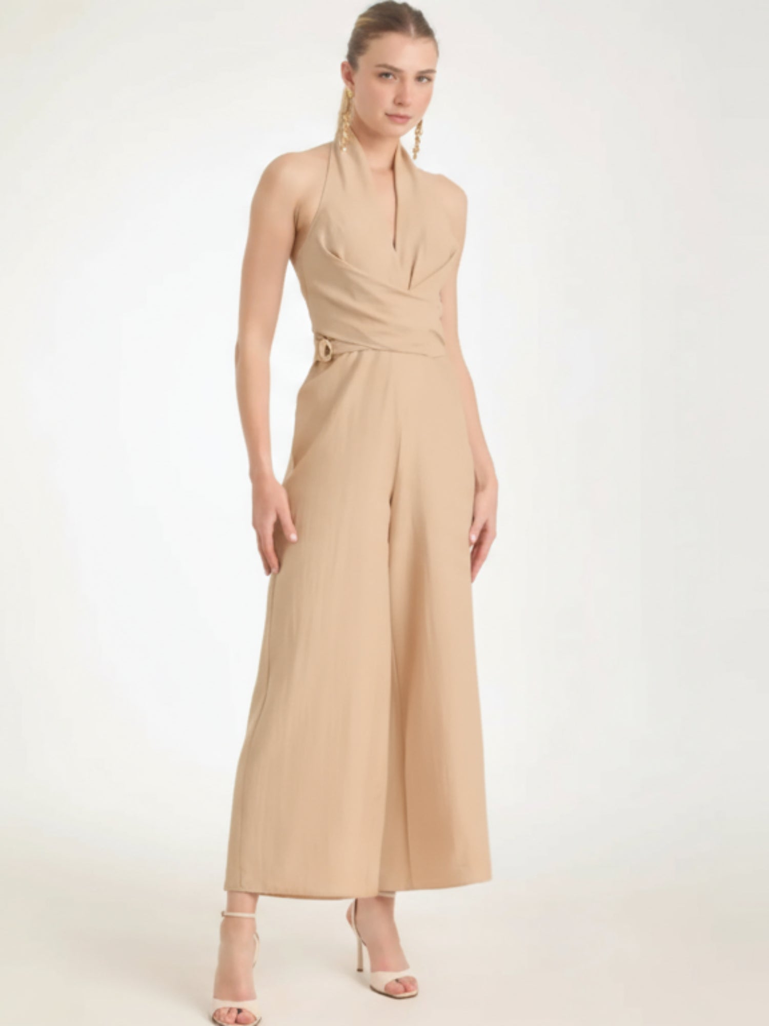 Enterizo de color rosa pálido con un escote halter profundo de corte cruzado que estiliza el torso. El pantalón es de corte recto y ancho (wide leg), aportando fluidez.