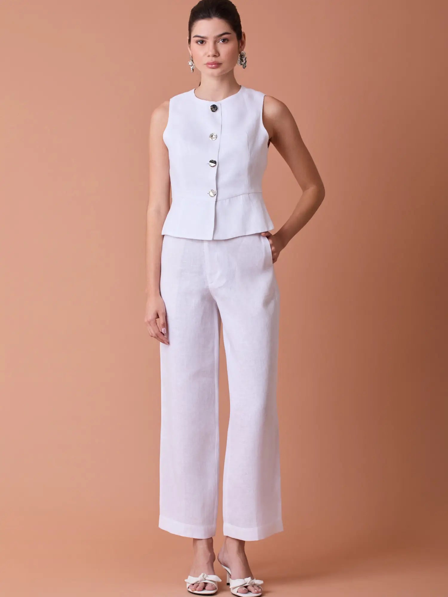 Pantalón de tiro alto con comfort fit, confeccionado en lino sin forro que aporta frescura y ligereza. Presenta pretina oculta para un acabado limpio y sofisticado, bolsillo tipo ojal lateral que suma funcionalidad y una bota guardapolvos que le da estructura y un look pulido.