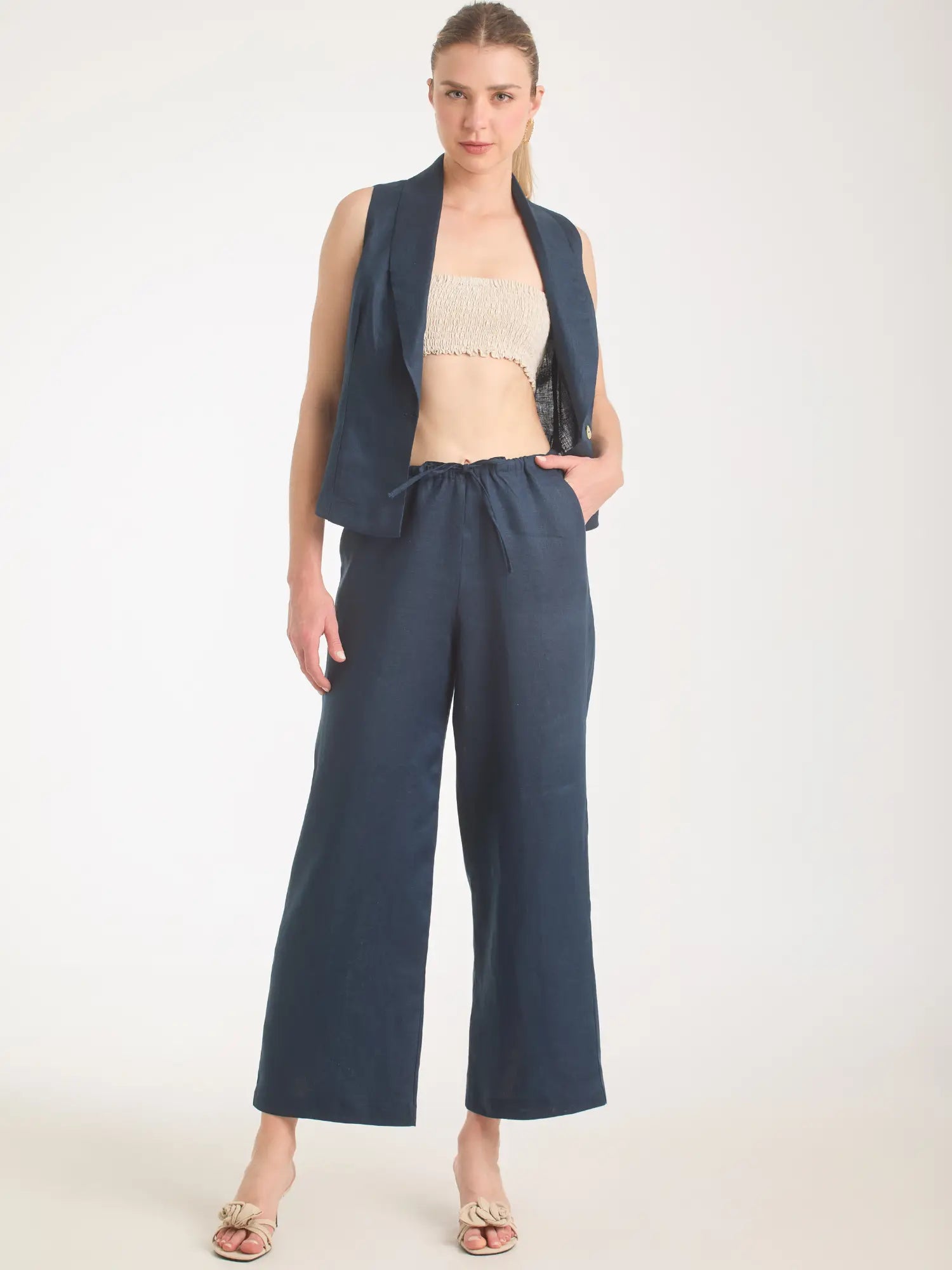 Pantalón de pierna ancha y tiro medio-alto; cintura elástica con cordón y bolsillos laterales, largo completo y caída ligera—comodidad premium para looks casual-elegantes.