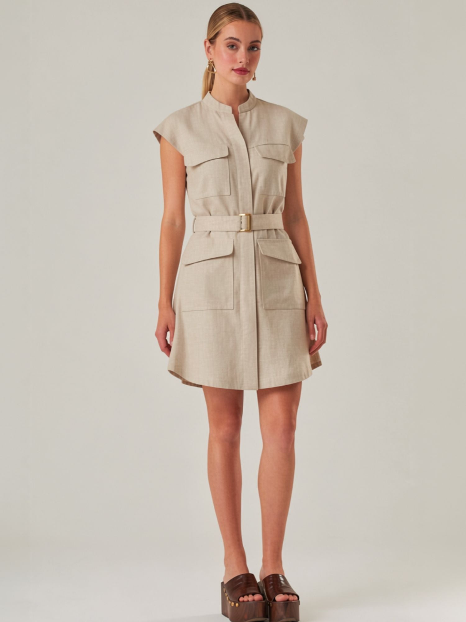 Vestido corto que destaca por su silueta relajada y versátil, diseñado con cuello tipo neru y manga corrida, aportando un estilo moderno y sofisticado. Su corte comfort fit brinda comodidad y libertad de movimiento, mientras que la cintura se define con un cinturón del mismo textil, logrando una figura equilibrada sin perder frescura.
