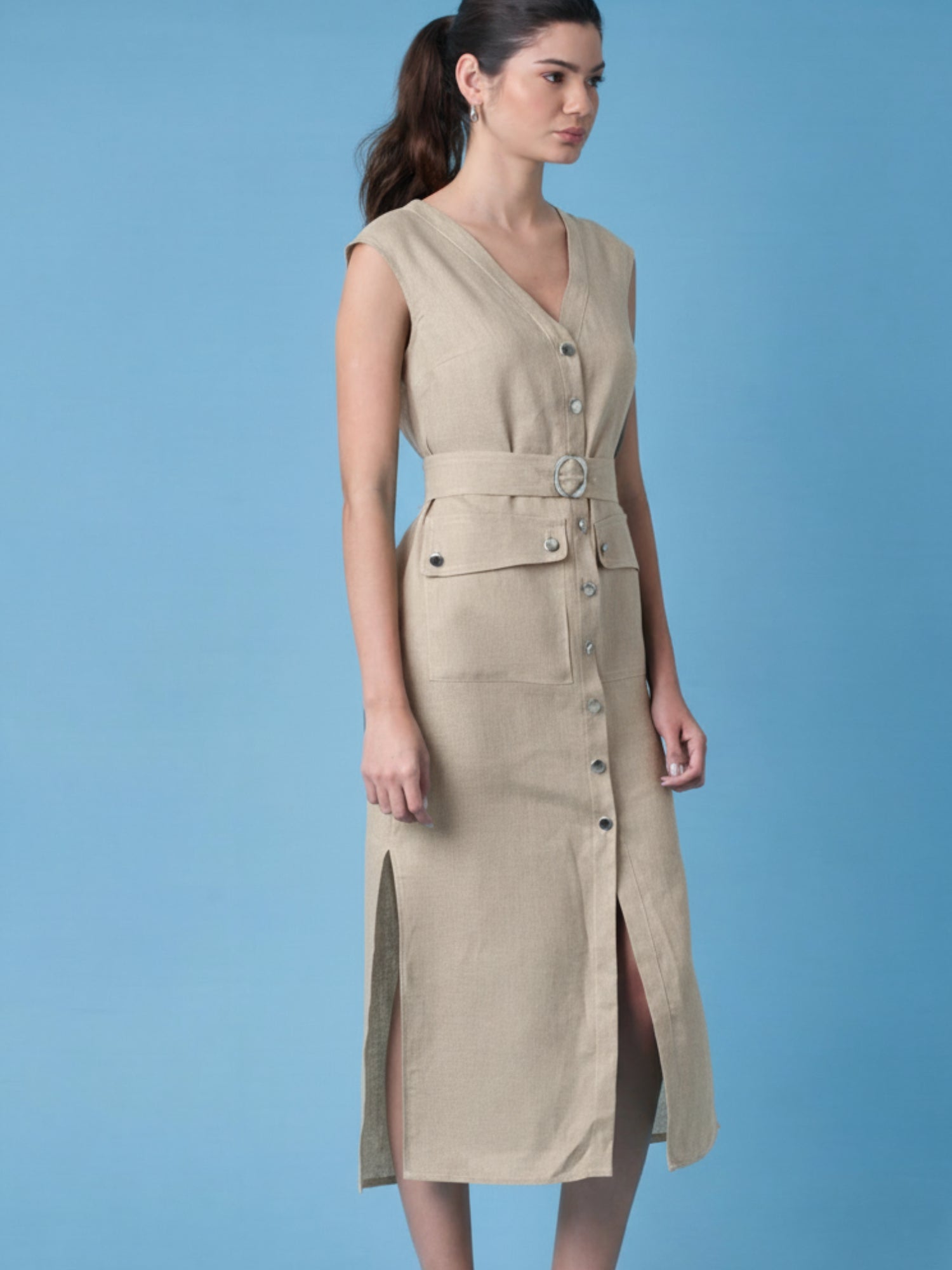 Vestido largo de escote en “V” y manga sisa, diseñado para un look elegante y natural. Su corte comfort fit aporta una silueta fluida y cómoda, ideal para mantener sofisticación sin sacrificar confort.