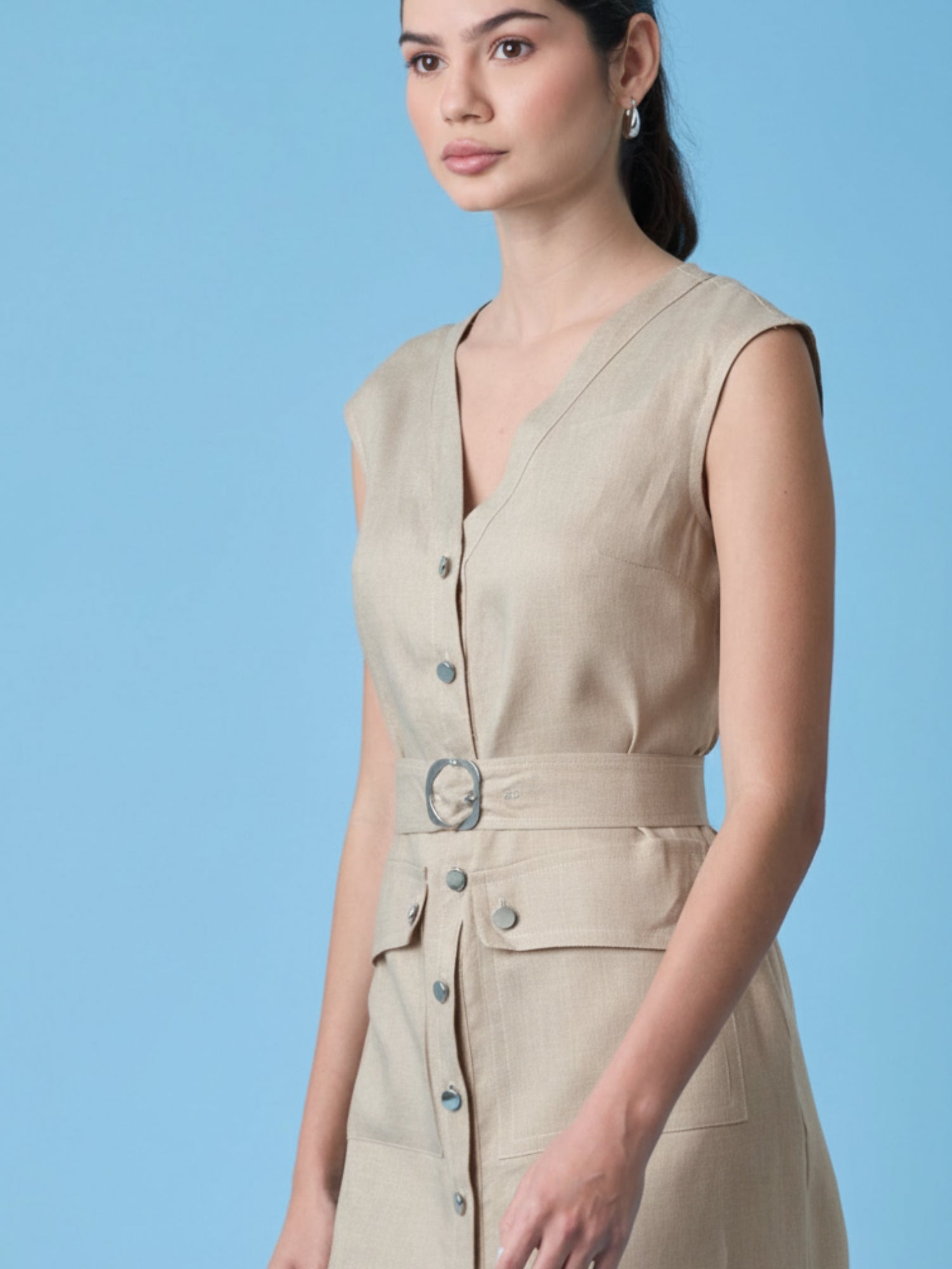 Incorpora abotonadura central, dos bolsillos parche con tapas asimétricas y cinturón del mismo textil, que permite ajustar la cintura de forma favorecedora. Un diseño versátil que se adapta perfectamente a eventos semi-formales como cenas de aniversario, inauguraciones, cocteles, brunch o bautizos.