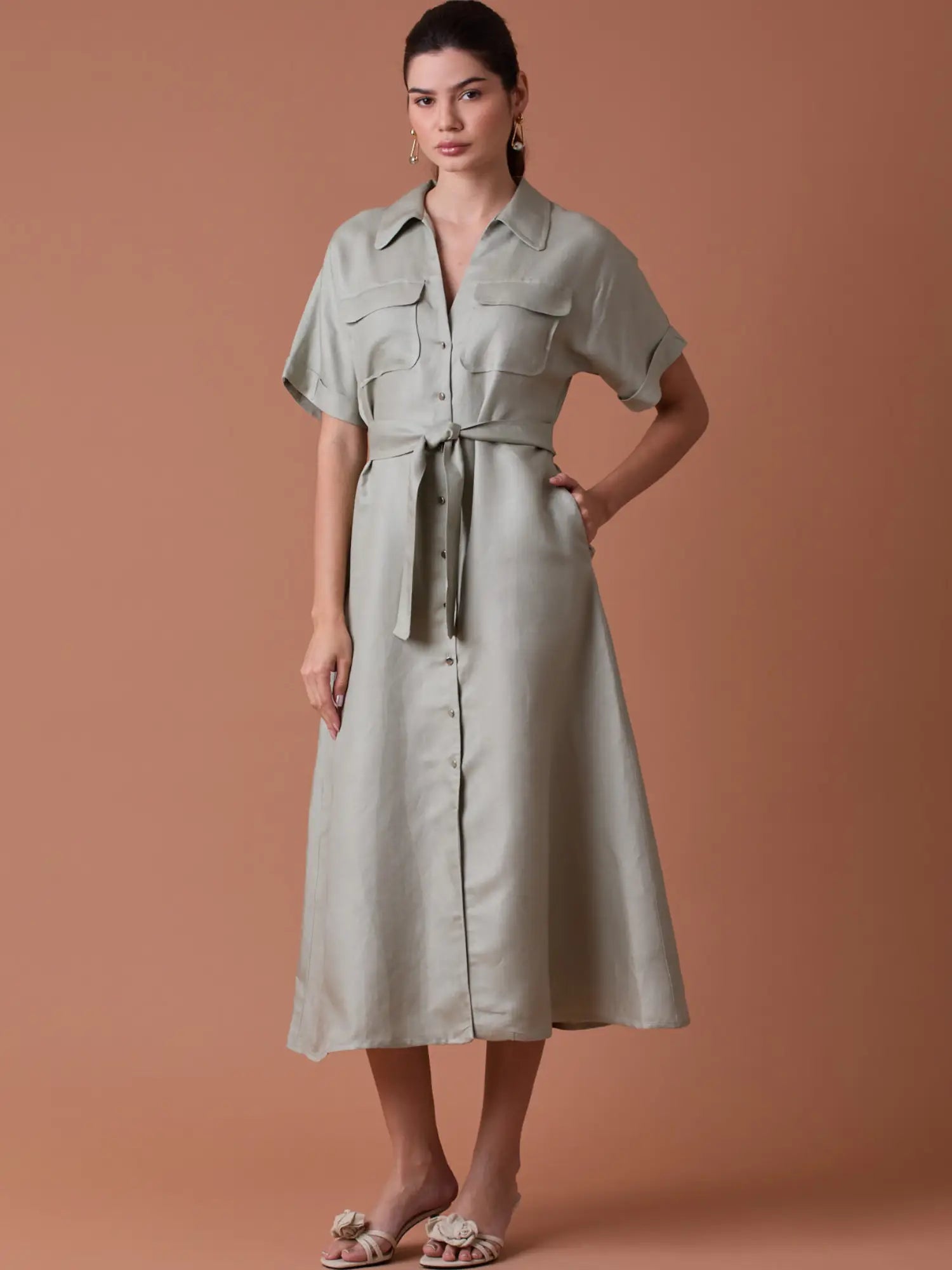 Vestido largo de cuello tipo camisero con escote en “V” y manga corta, diseñado para ofrecer un equilibrio perfecto entre elegancia y funcionalidad. Presenta abotonadura central que recorre el frente, aportando un estilo clásico y versátil, junto a dos bolsillos parche con tapas que añaden un toque utilitario y moderno. Los puños resaltados elevan el diseño con un acabado pulido y cuidado.