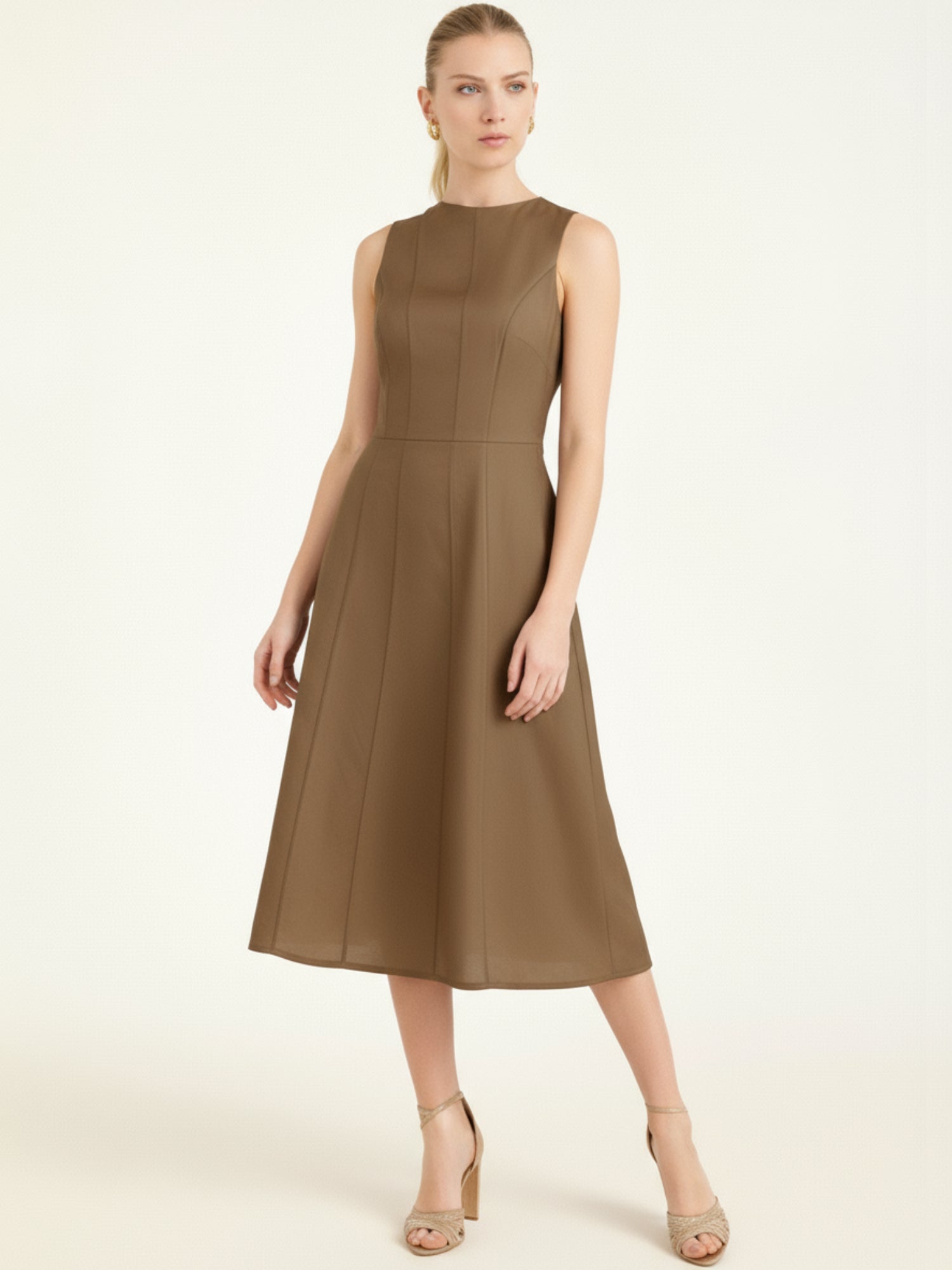Vestido midi sin mangas, cuello redondo y costuras verticales que estilizan; corte fit & flare con falda evasé y acabado pulido—elegante para oficina y eventos
