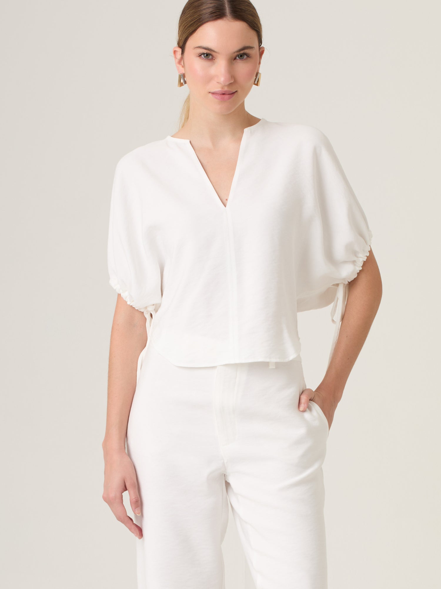 Blusa con escote en V y manga globo fruncida con lazos laterales caída ligera y largo a la cadera que estiliza, versátil y favorecedora para looks casual-elegantes.