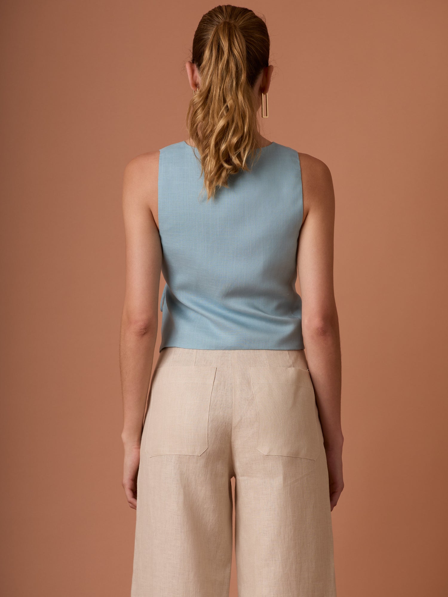 Blusa sin mangas con escote en “V” y silueta tipo cruzada, confeccionada en una mezcla ligera de tencel y lino, ideal para mantenerte fresca y cómoda. Cuenta con ajuste lateral con tirante en la cintura, lo que permite definir la figura de manera sutil. Su diseño regular fit y su textura suave con forro interior aportan elegancia y naturalidad.