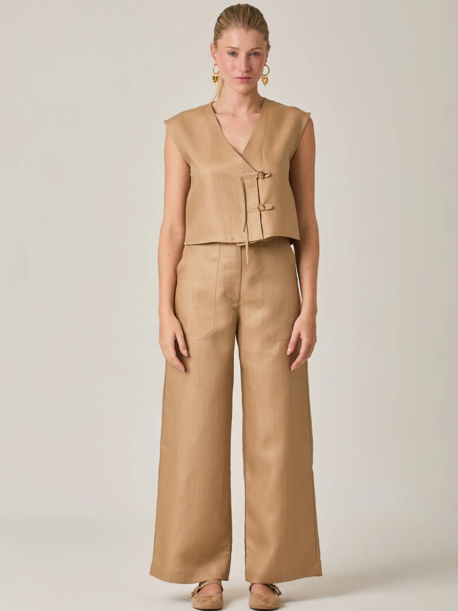 Pantalón de corte recto y delicadamente amplio que aporta caída suave. Con pretina clásica, cierre frontal con botón forrado y bolsillos laterales amplios que suman estilo y practicidad.  Perfecto para crear looks casual chic, usar en el día a día, la oficina, salidas al aire libre, brunch o planes con amigos.