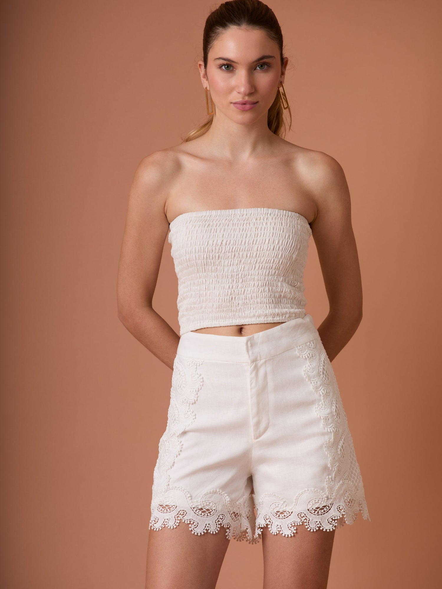 Short confeccionado en lino de tono blanco, una prenda que combina frescura, comodidad y estilo. Su diseño de tiro alto y corte comfort fit estiliza la figura sin perder libertad de movimiento, ideal para lucir en climas cálidos.