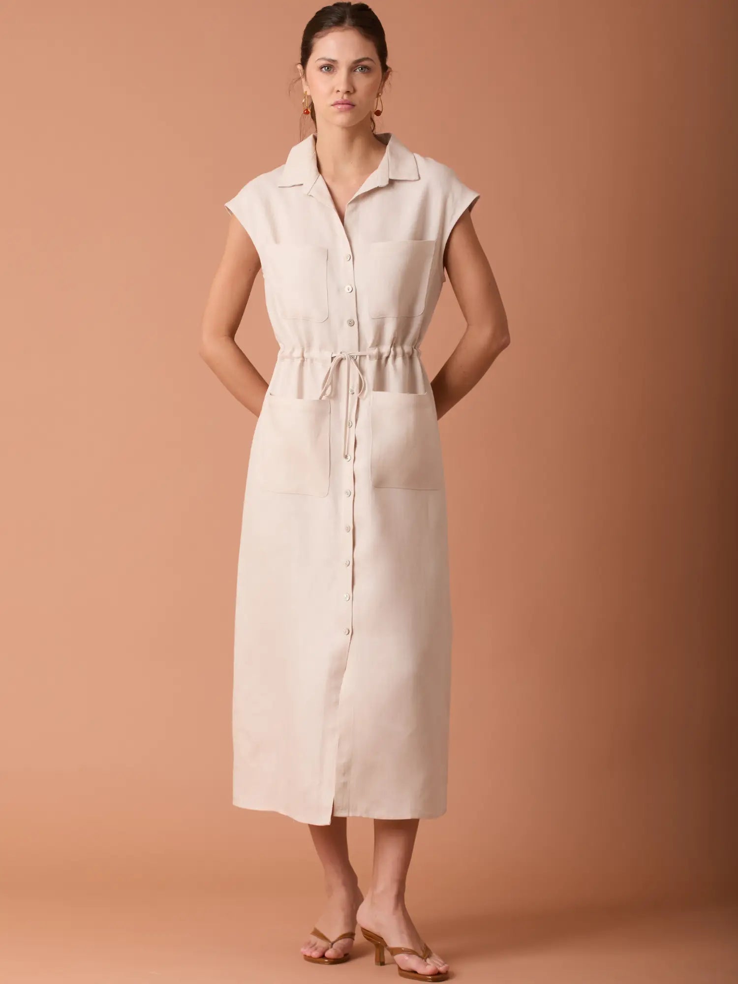 Vestido tipo camisero midi se combina con un corte sin mangas y un cuello clásico, logrando una prenda versátil y cómoda para el día a día, con abotonadura y bolsillos amplios y un ajuste en la cintura con cordón que estiliza la silueta.