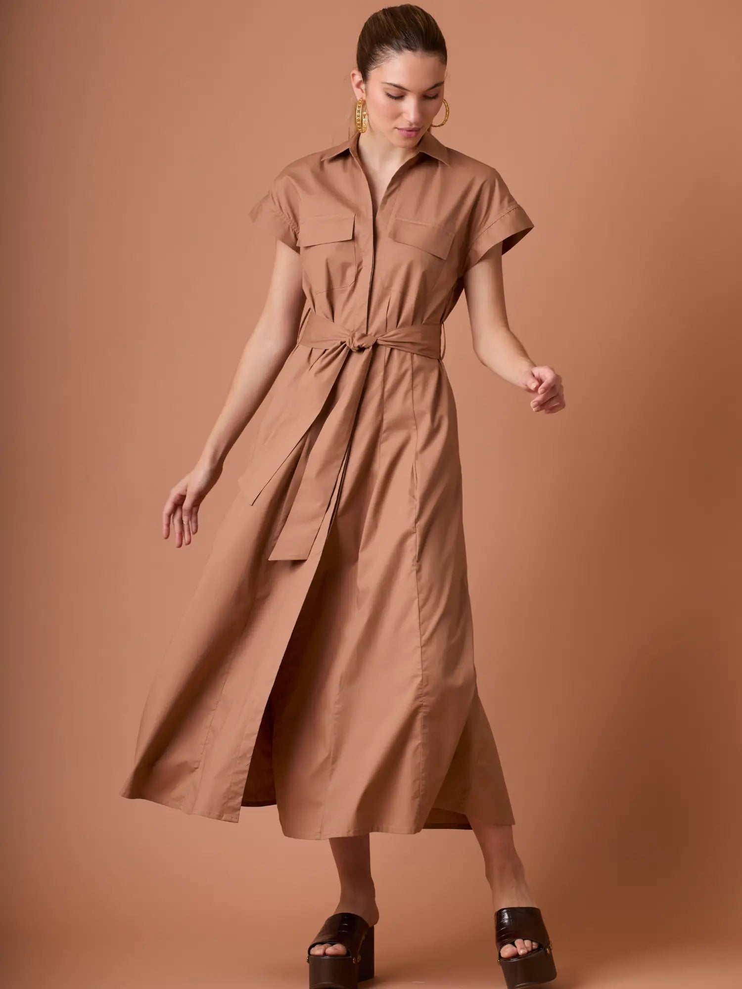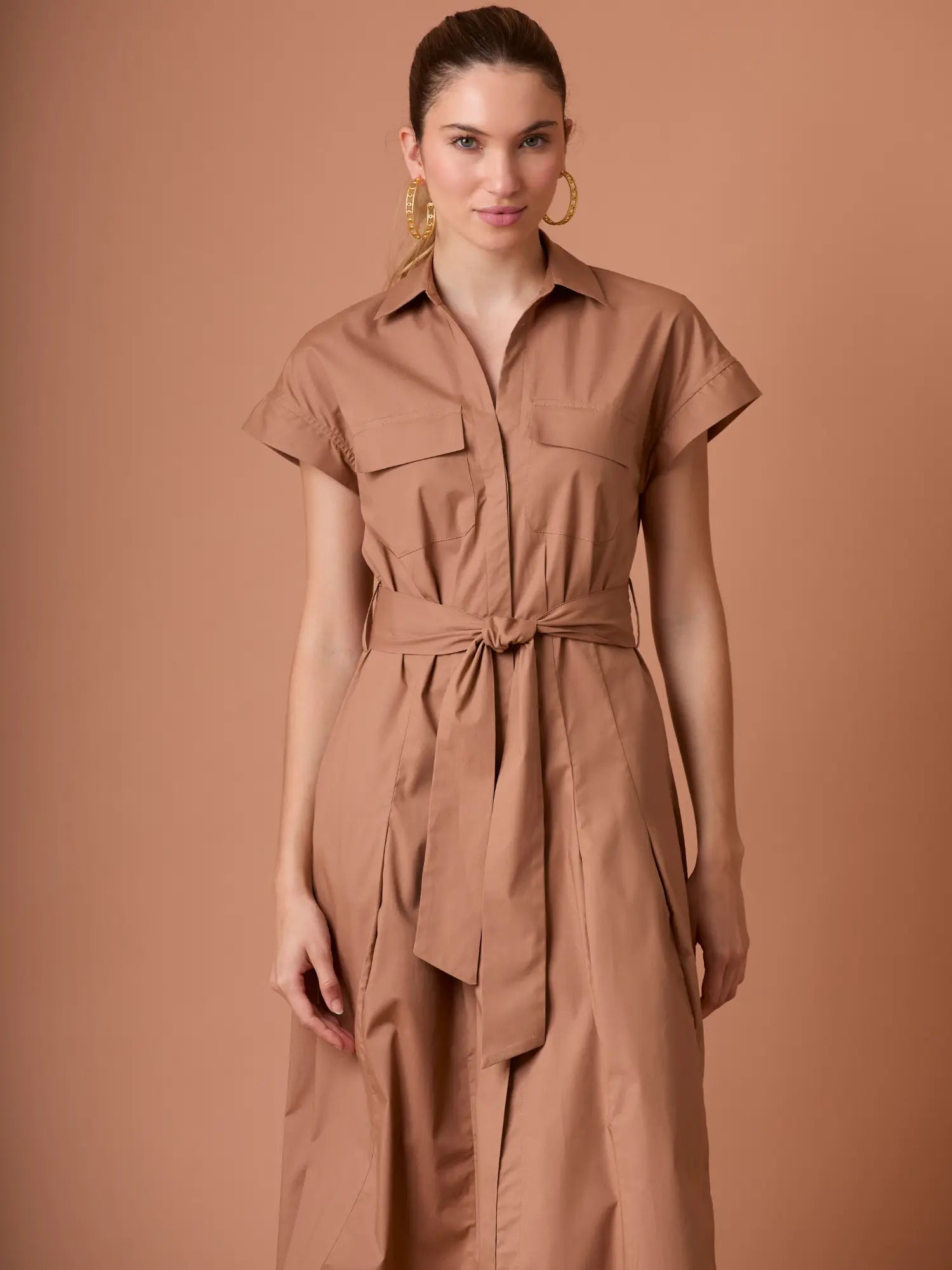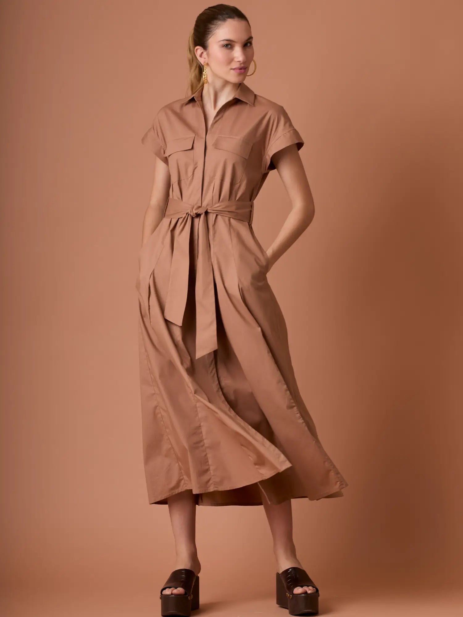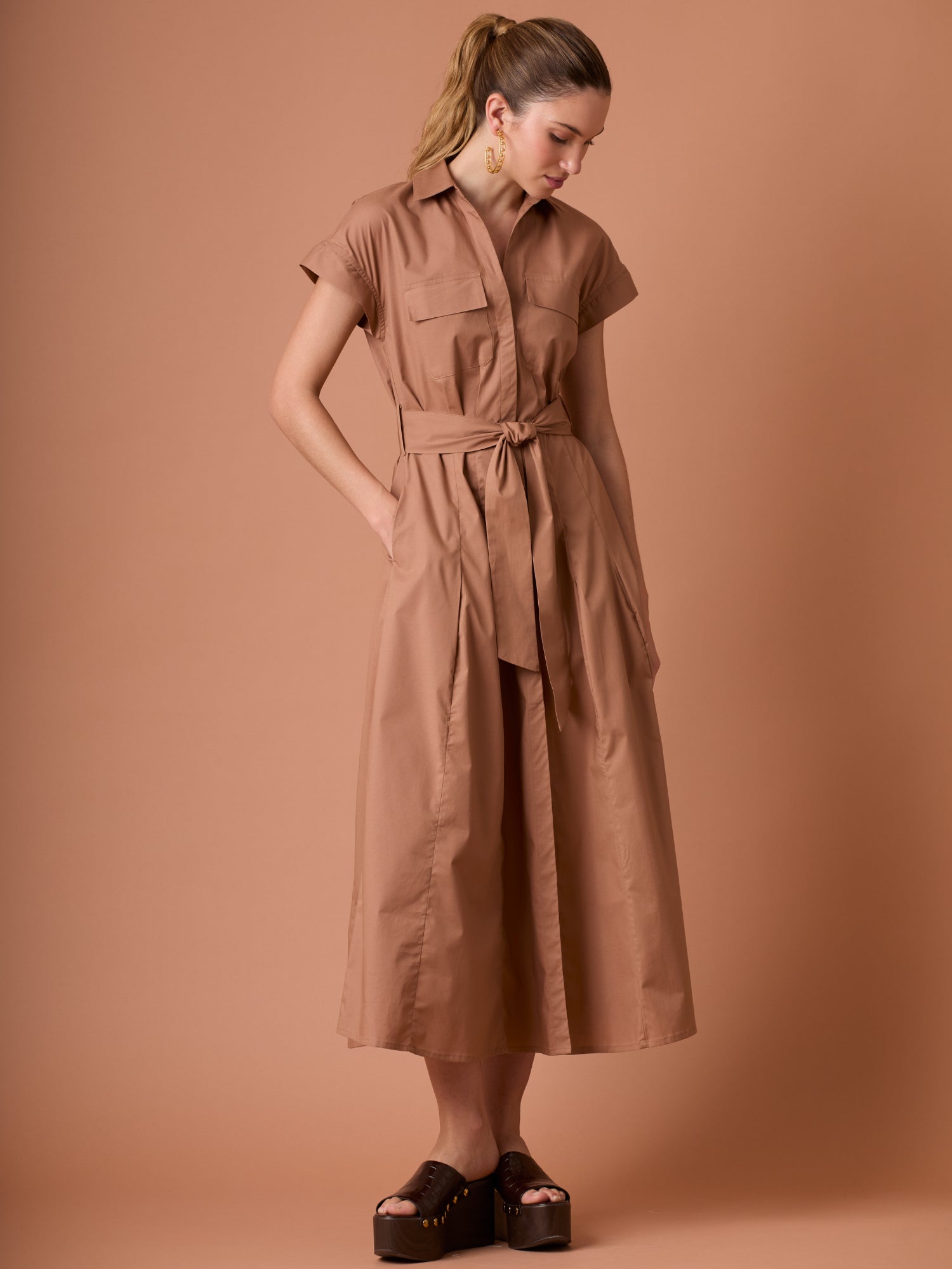 Vestido midi con cuello clásico y manga corta, con un lazo ajustable en la cintura, que permite estilizar la figura. El corte fluido de la falda añade movimiento natural y los bolsillos le dan un toque funcional y moderno.