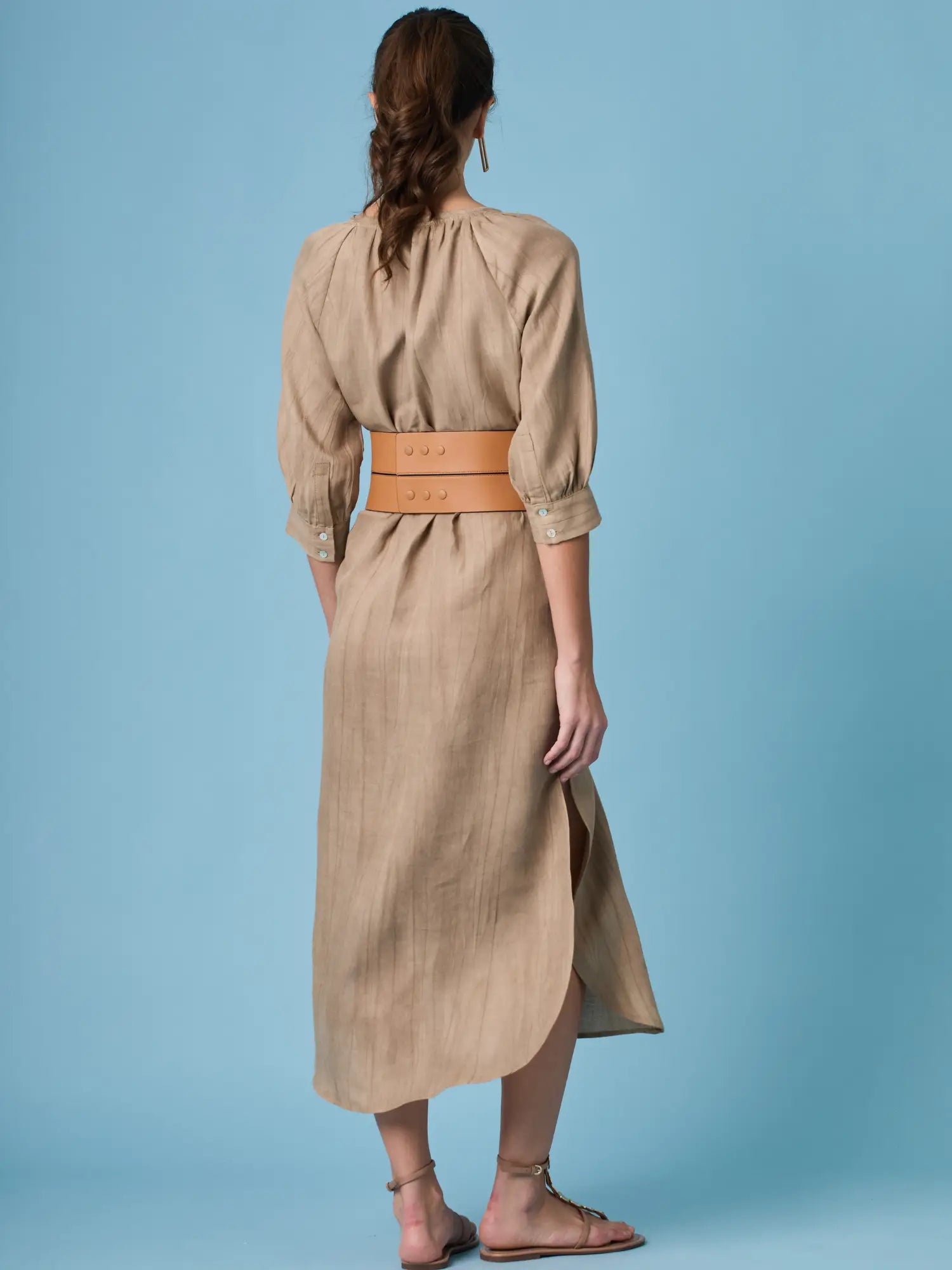 Vestido midi de tejido ligero, cuello en V con cordones y manga 3/4; silueta relajada tipo túnica con caída fluida y textura sutil—elegante y versátil de día a noche.